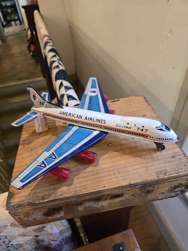 Vintage American Airlines Boeing 747 tin toy airplane. 10 1/2" long S. Seem Antiques 100 S. Chestnut Street Bath, PA 18014 Open 7 Days A Week!