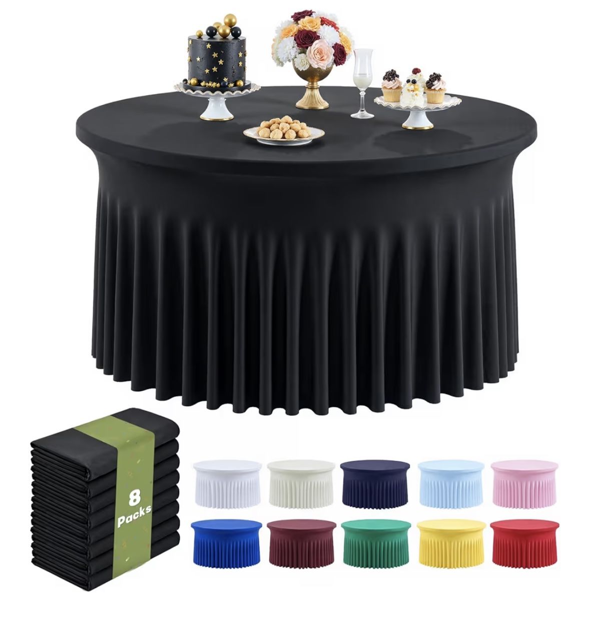 8 Pack Black Spandex Tablecloth for 72in/6FT Round Tables, Wrinkle Free Tablecloth with Skirt for Wedding, Graduation & Banquet