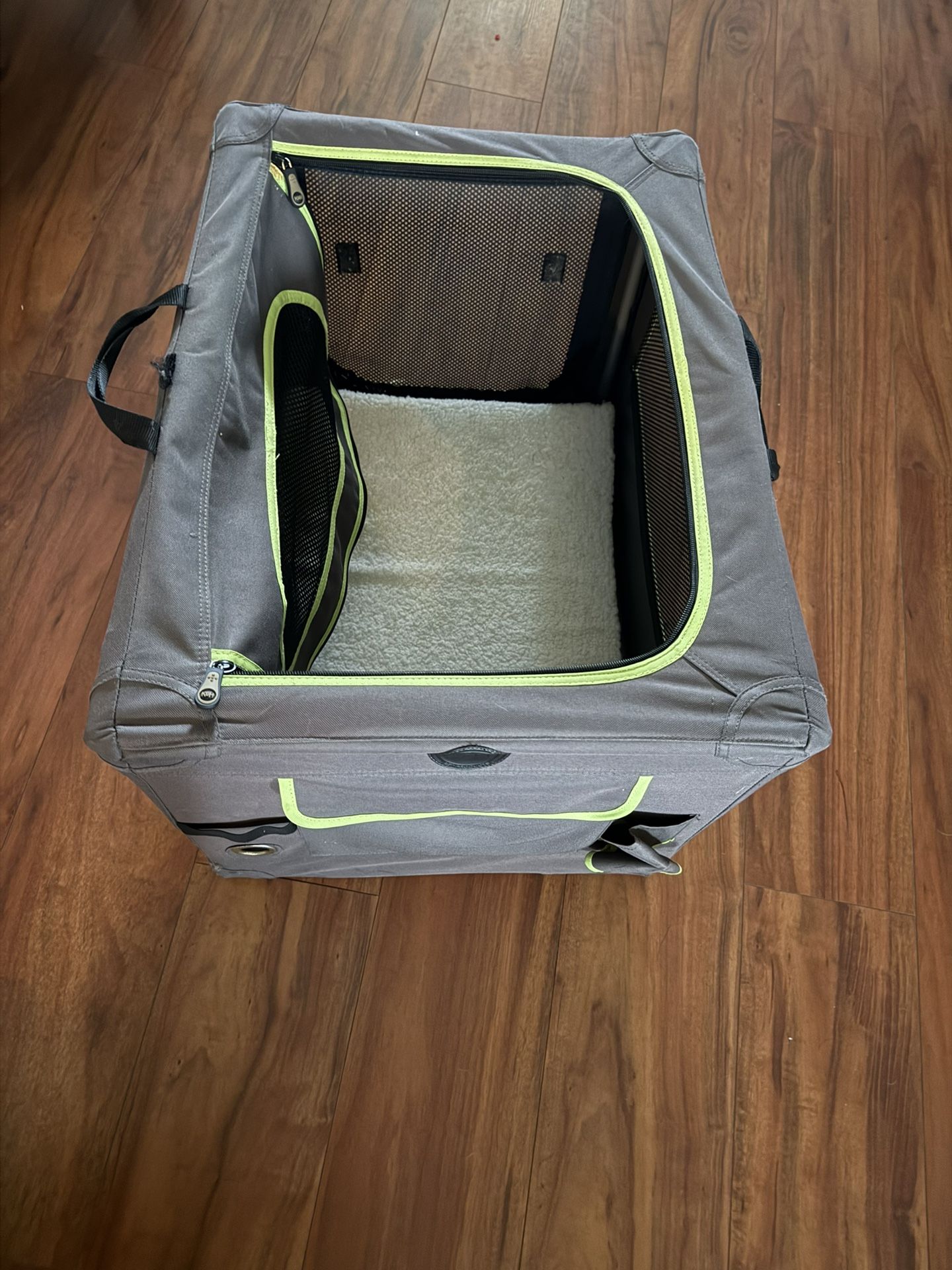 Large dog carrier in good condition. Measures 26 inches tall and 24 inches wide. Designed with mesh on three sides for airflow and visibility, making it comfortable for your pet. Includes a storage pocket and built-in cup holder, perfect for treats, leash, or drinks while traveling. Great for trips, vet visits, or everyday use.