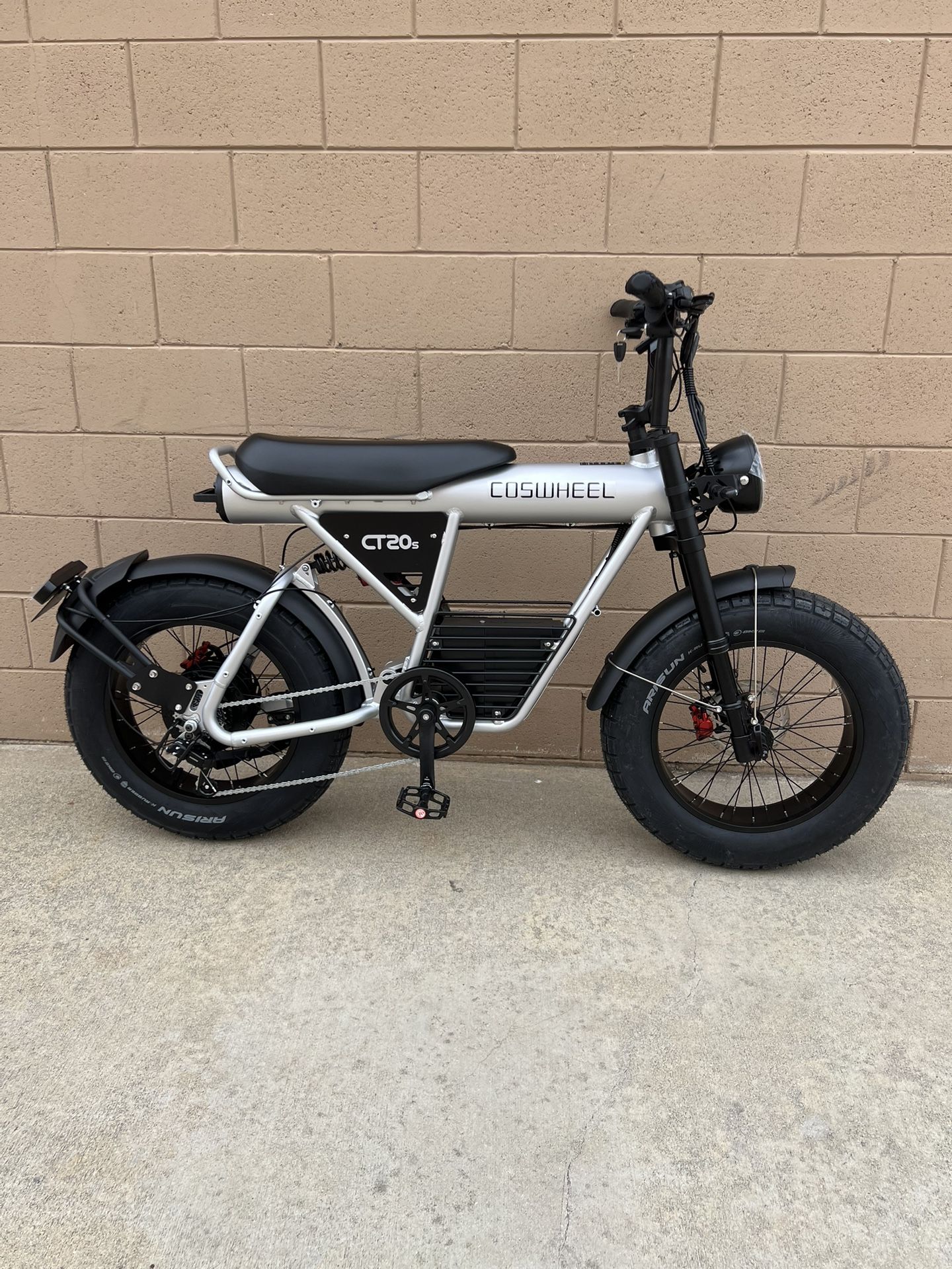 COSWHEEL CT20S Dual Suspension 2000W Peak Electric Bike **** Financing Available **** Suitable Height: 5'1" - 6'5" 1500 Watt (2000W Peak) Motor Dual Suspension 120 Nm Torque 60V 27.5Ah 1650Wh Lithium Ion Battery 55 Mph Top Speed Up To 100 Miles Range with Pedal Assist Front and Real Suspension Front & Rear Hydraulic Disc Brakes 330 Lbs Max Load SHIMANO 7-Speed All Terrain Tires e-bike CT20S Specifications Top Speed: Class 2/3, 28+ Mph (45+Km/h); Off-road Mode +++ (60V) Range: 55+miles (88km) in Class-2 throttle-only mode (pure electricity); 100+miles (161km) in Class-1 PAS (pedal assist) Motor: 60V Peak 2000W (Rated 1500W) Brushless Rear Hub Motor 120N.m Battery: 60V 27.5Ah Battery (Lithium 18650 Cells) Energy: 1650Wh Front Suspension: 20" Shoulder Shock Absorbing, 80mm Travel Rear Suspension: 180mm Travel Brakes: Double Piston Oil Brake, Equipped with 180mm Stainless Brake Disc Tires: Off-road Tire 20" * 5.0" IA-2149 with AV+Lining Throttle: Grip Twist Throttle (Old) / Thumb Throttle (New) Charger: 60V5A Charger Charging Time: 3.5-8.0 Hours Display: Easy Read LCD Display Controller: 60V 35A Front Light: Classic Angel Eye Headlight, 120 LUX Rear Light: LED Pedal Assist: 3 Levels Sensors: Speed Sensor Frame: Hydroformed Triple-Butted 6061-T6 Aluminium Alloy Pedal: Aluminum Alloy Pedal, with Reflect-light, Axis 9/16 x2 Crank: 1/2 "*3/32"*46T 7-speed ED Tooth Plate Rear Derailleur: Shimano 7-Speed Chain: 7-speed Anti-rust, 1/2" * 3/32" Handlebars: Sand Black 31.8*660 Suitable Height: 5'1" - 6'5" Seat Height: 33.4" (85cm) Bike Height: 45.3" (115cm) Wheelbase: 45.3" (115cm) Handlebar Width: 26.4" (67cm) Bike Weight: ≥88lbs (with Battery) (≥40kg) Maximum Load: 330lbs (150kg) Safe Load: 265lbs (120kg) Overall Size: 70.9" * 26.4" *45.3" (180*67*115cm) Package Size: 59.4" * 14.2" * 35.4" (151*36*90cm)