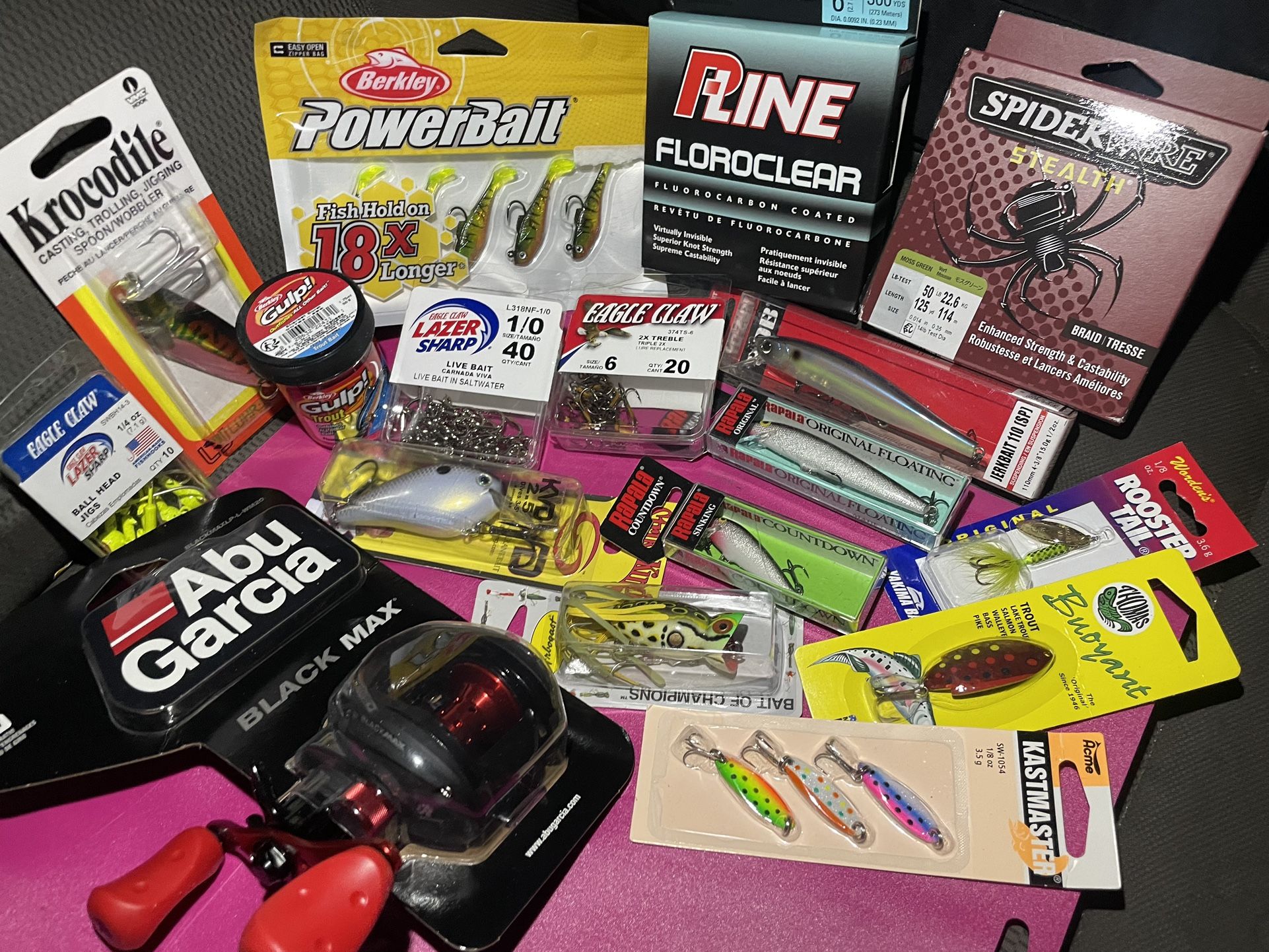 Abu Garcia BlackMax-P-L-WM20 fishing reel LOT fishing lures, bait, fishing hooks, spider wire fishing line , P-Line fishing line + MORE everything in Picture is what you get!