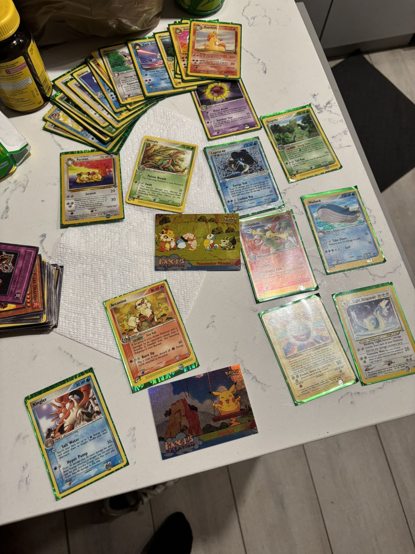 Mostly from the early 2000s there aren’t any crazy cards some holos and reverse but a lot of trainers and commons and items and energys some cool cards they have ware as they were used. Not really looking for some one to look through each card so the whole set is $200 and there are even some yugioh cards.