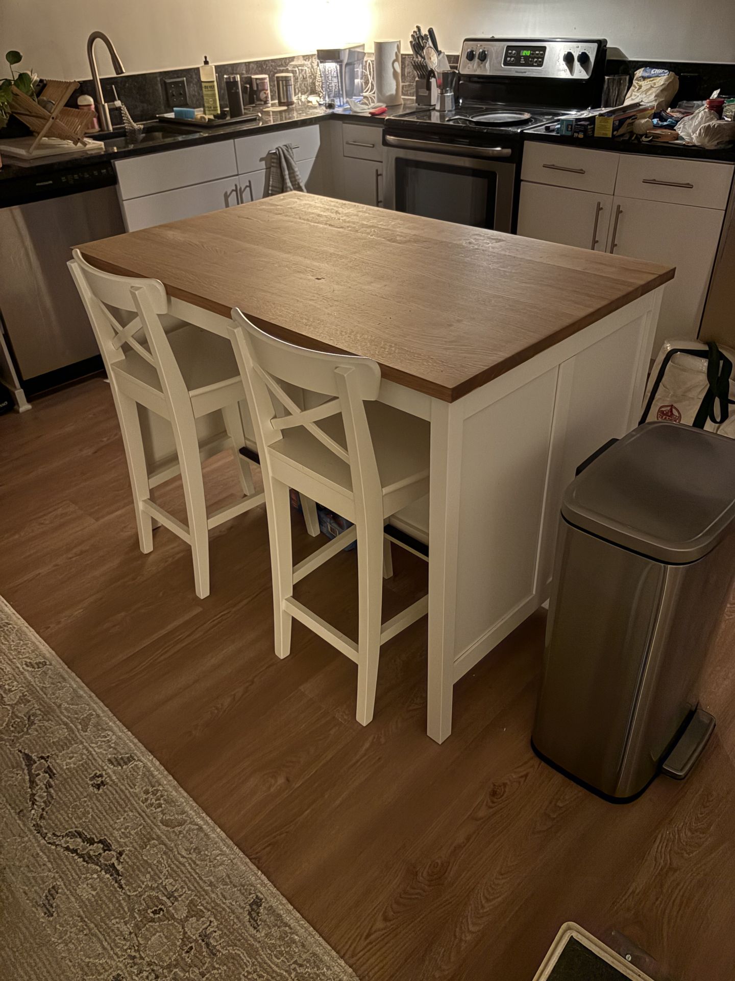 Kitchen island with chairs, white color with wooden top. Sturdy, can hold a lot of weight. 2 tiers for storage. 49.5 in long, 30 in wide, 35 in tall.