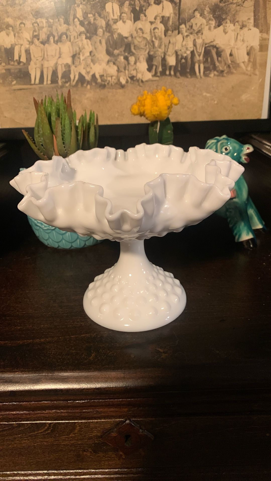 VINTAGE FENTON HOBNAIL MILK GLASS RUFFLED EDGE PEDESTAL CANDY DISH COMPOTE