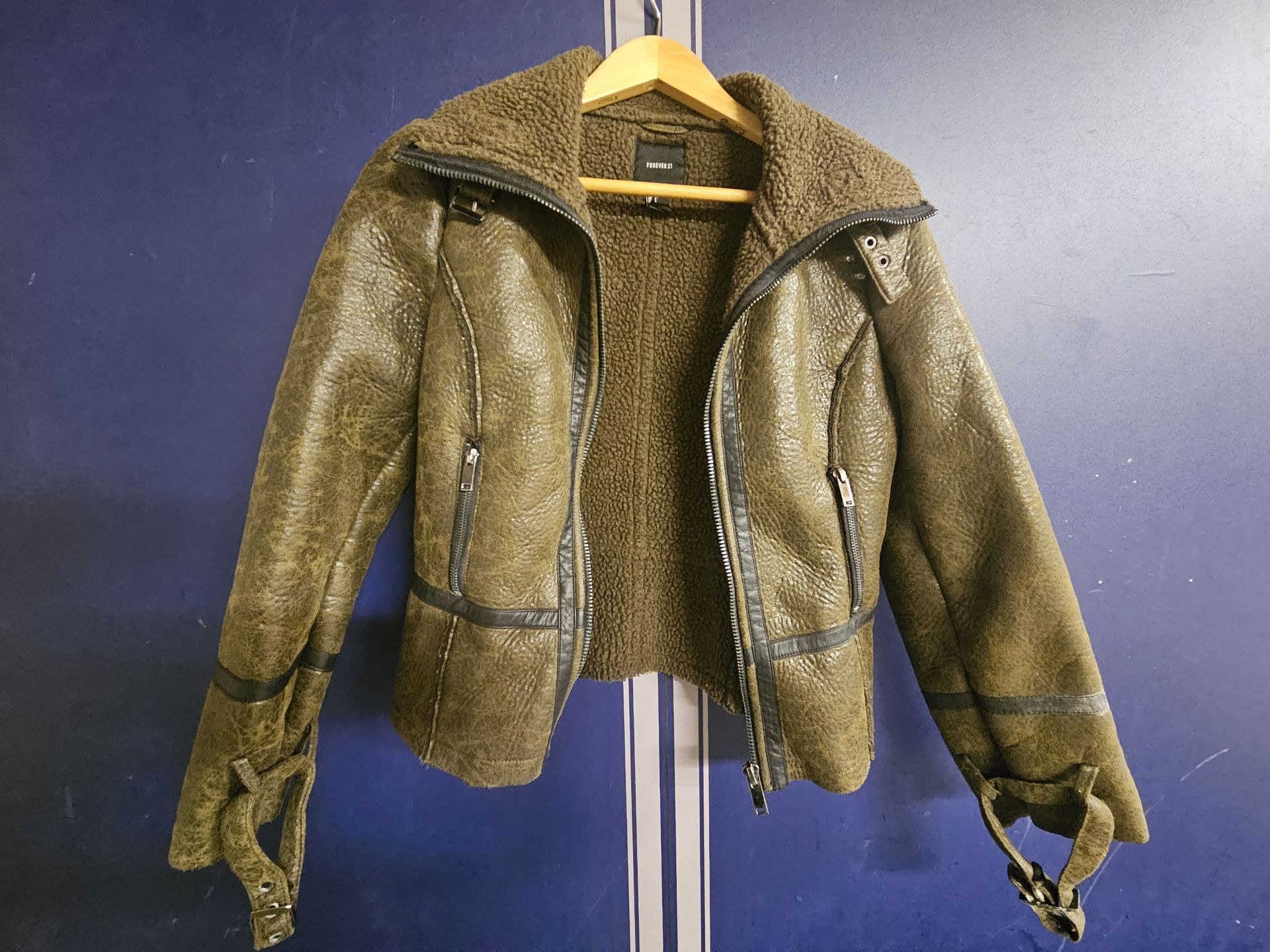 This Forever 21 jacket features a faux leather exterior with a cozy sherpa lining. It's a size S. The moto style includes zippers and buckles for a classic look.