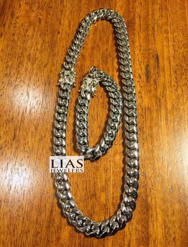 Brand new 18 k white gold filled Cuban link chain and bracelet Available in most sizes! Also have men’s jewelry Cuban link set men’s necklace chain bracelet Miami Cuban link tennis link set Figaro chain set