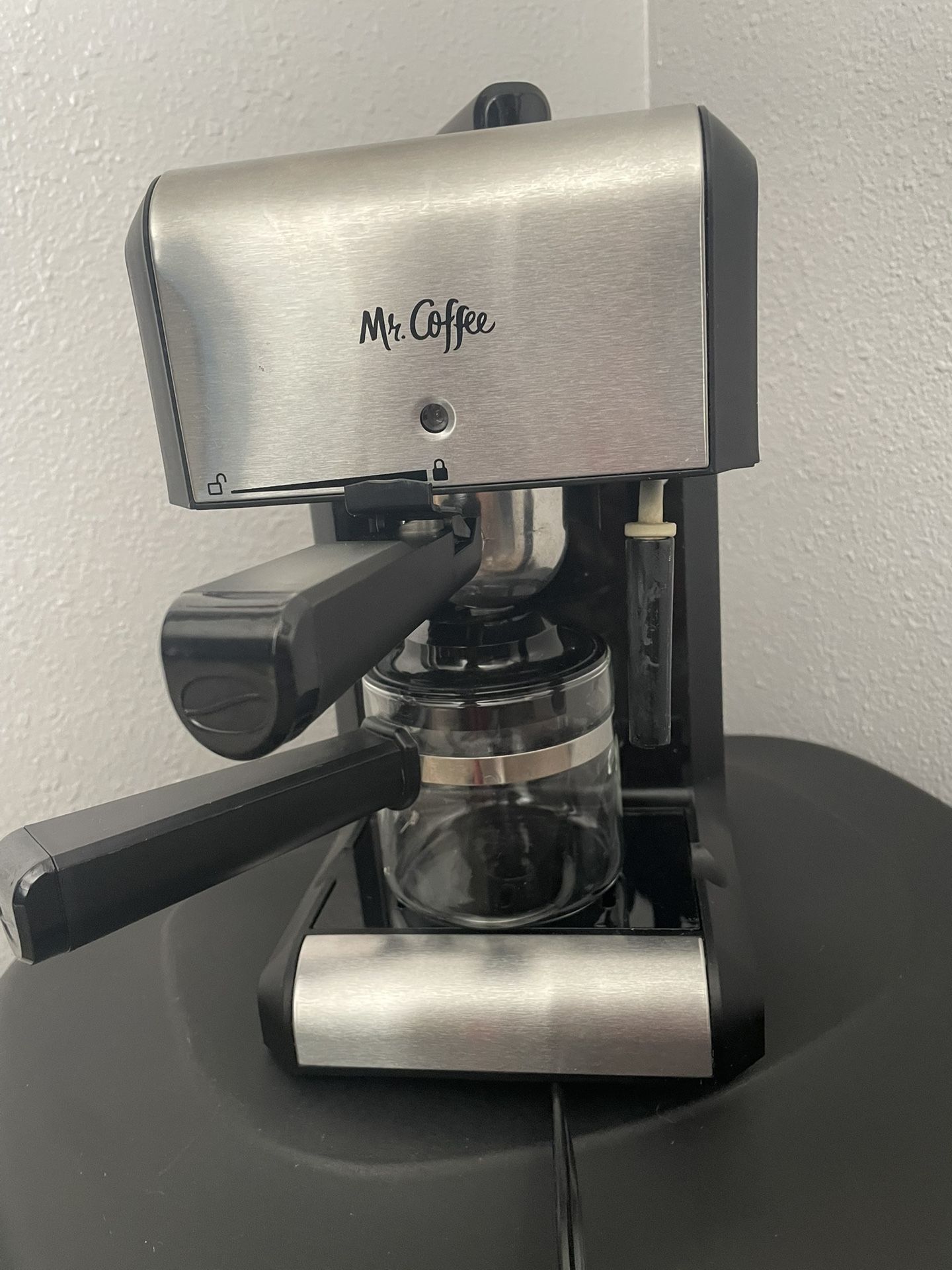 Mr. Coffee 4-Shot Steam Espresso, Cappuccino, and Latte Maker. Also it has a frothing wand for steaming and frothing milk for lattes and cappuccinos. Used 3-4x is like new and in very good condition. Or best offer.