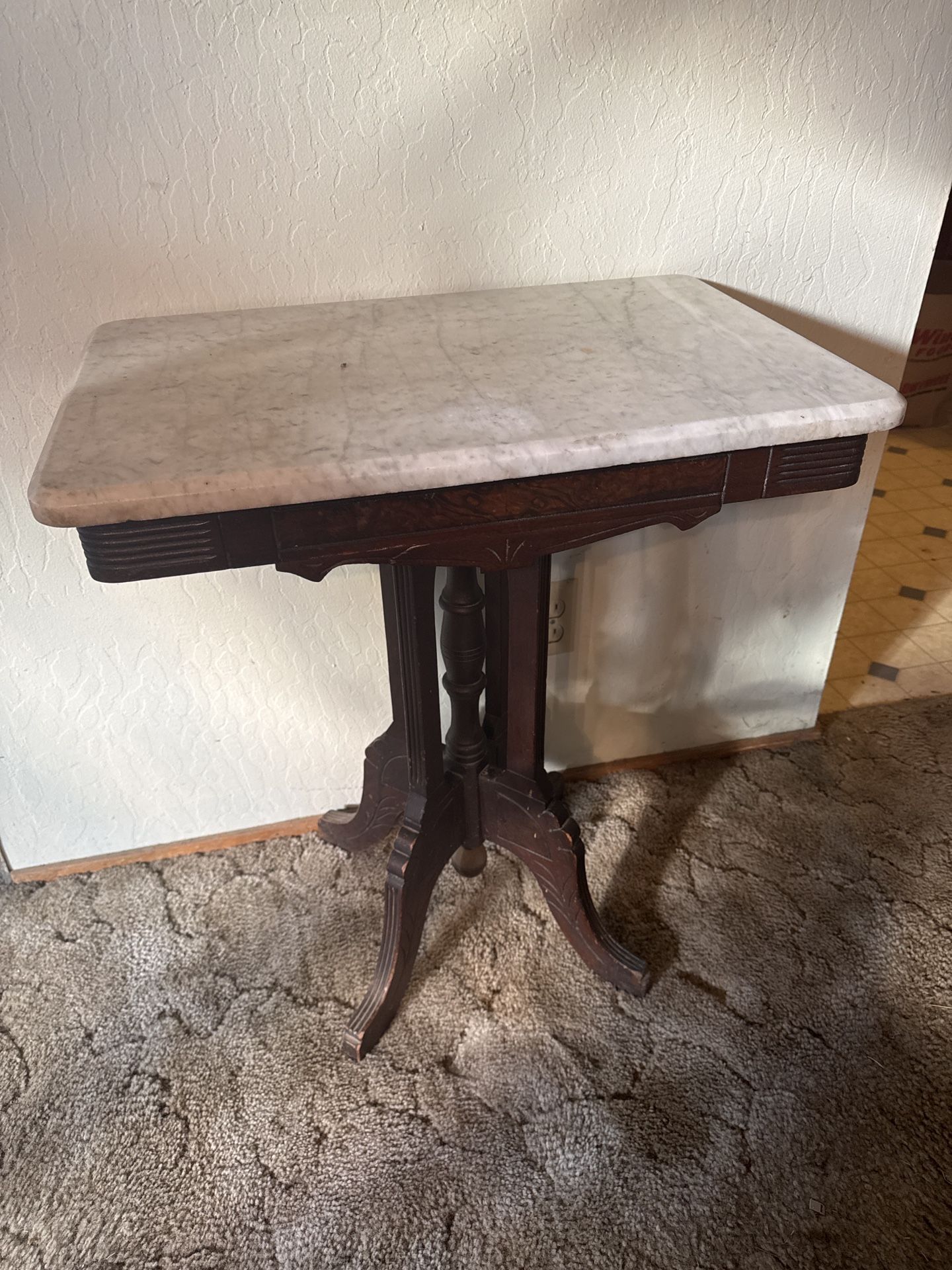 Make me an offer! What this table is • Late 19th–early 20th century pedestal table (c. 1880–1910) • White/gray marble slab top (real stone, not composite) • Carved hardwood base (likely walnut or mahogany) • Tripod pedestal with turned center column • Originally used as a parlor table / lamp table / occasional table This exact style was extremely popular in Victorian and early Edwardian homes. The marble is one solid piece no cracks, but does have some surface stains and ware. The wood has never been refinished and does have some nicks and ware marks.