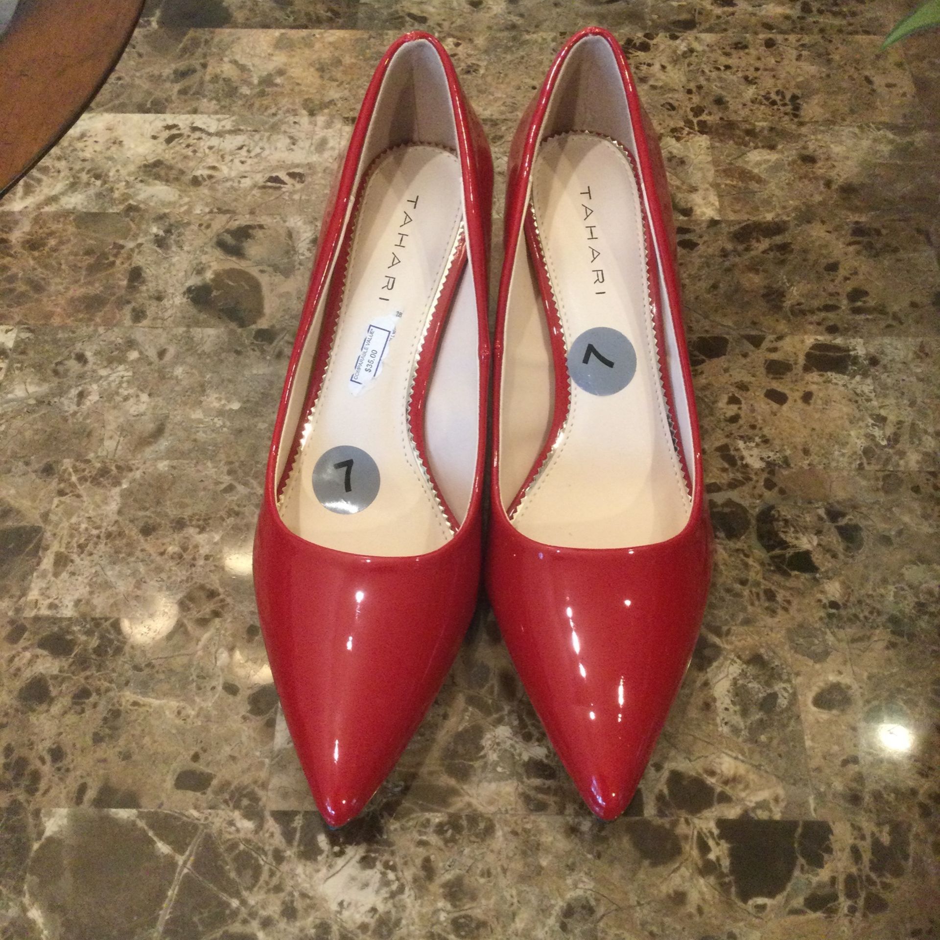 I have this shoes in my closet it is never wear or used the brand is Tahari the size is 7 the color is red you could wear it with dress or wear with jeans or skirts very very good condition if you like my page just text me and I will help you brand new shoes