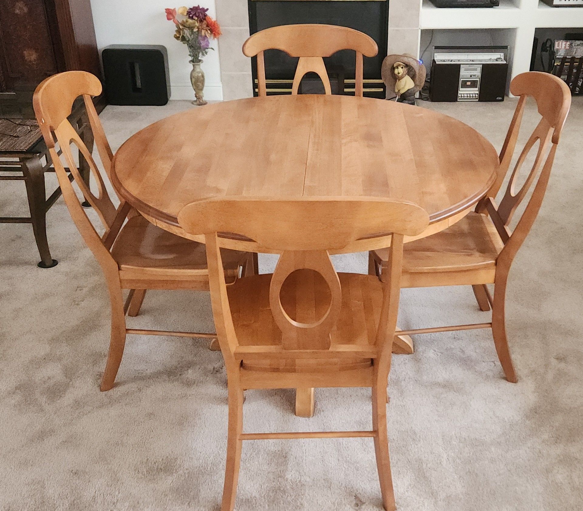 Bedard furniture, often associated with Shermag, is known for high-quality, solid maple dining sets featuring Farmhouse, Colonial, or Early American designs made in Canada. These durable pieces, including chairs and dining tables with, often feature traditional, handcrafted details like Windsor-style chairs. Key details about Bedard furniture: Material: Primarily constructed from solid maple wood. Item is in excellent condition...... The table is 45" across & 30" high. The leaf is 20" wide & 45 "long.