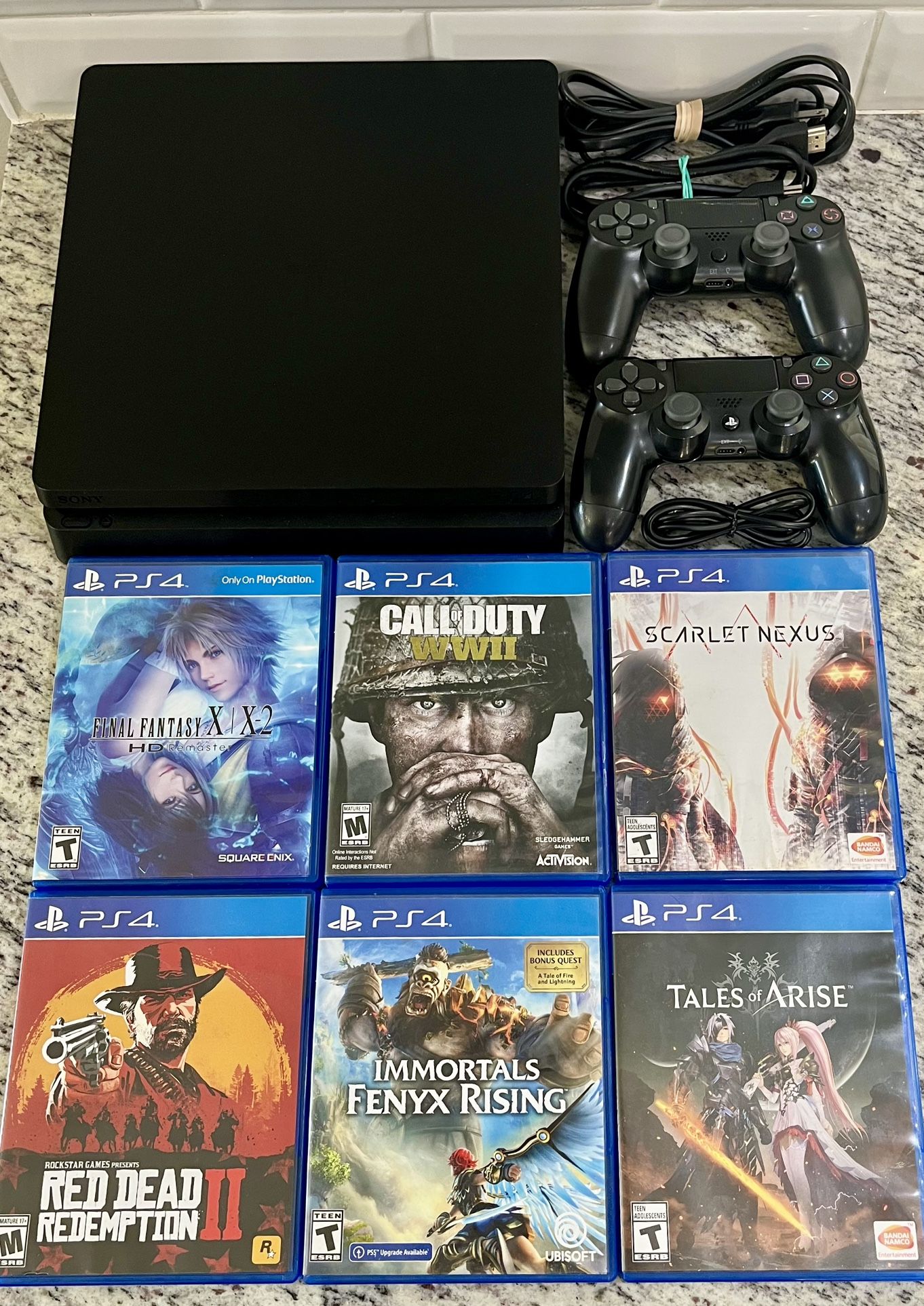 PlayStation 4 Slim in excellent condition with 1TB storage. This bundle includes two wireless controllers with charging cable, HDMI cable, power cord and 6 games. Please see pictures for details.