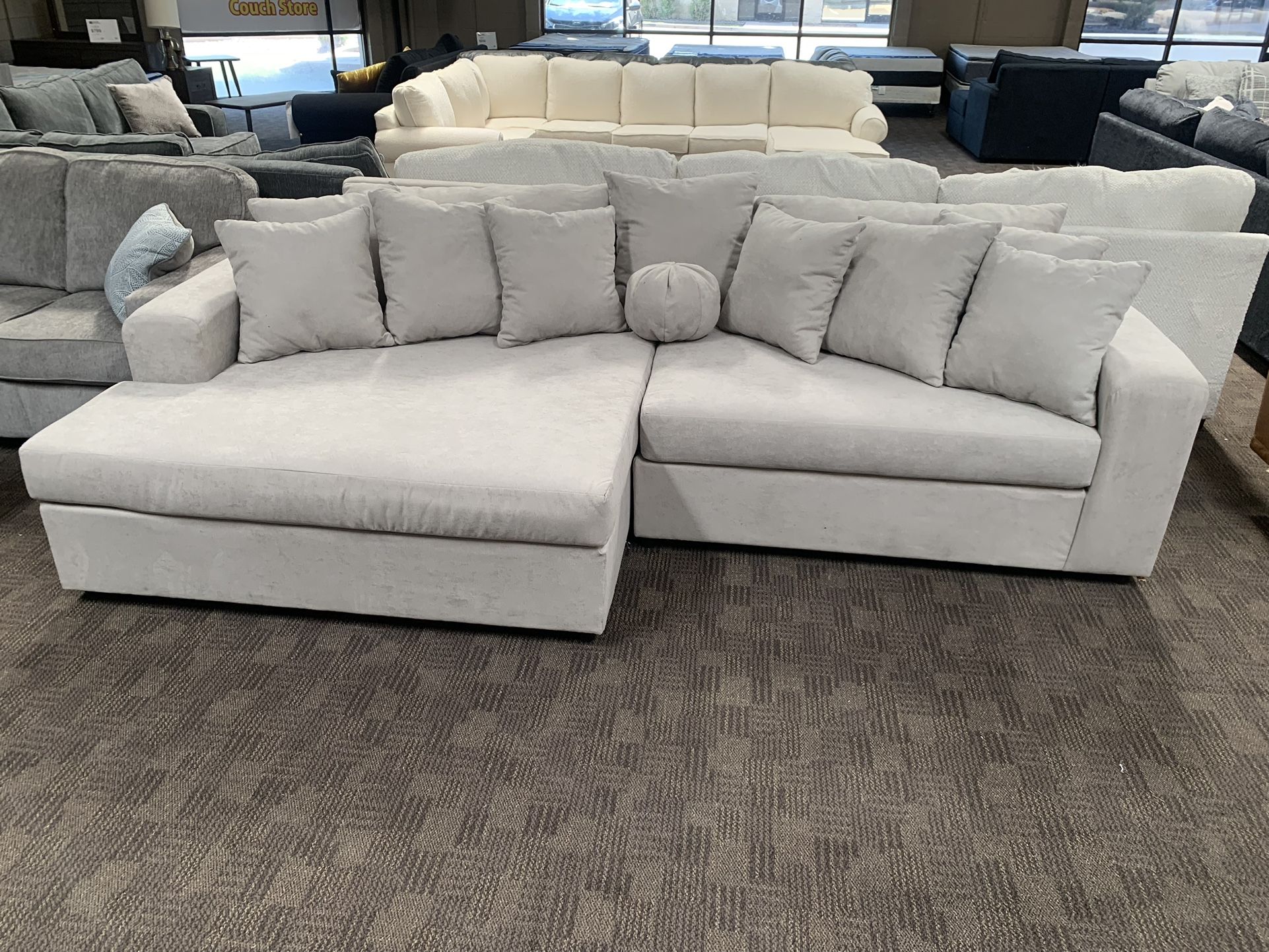 Brand new. Big oversized cushions and chaise. Super deep and comfy! Extra soft fabric. Can be ordered in other colors and fabrics. Measures 120" x 72" (50" depth) Delivery and payment plans available