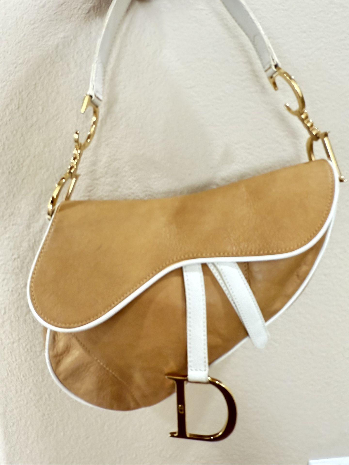 This is one of Carrie Dior bags from Sex in the City and it is in gorgeous bi color tan with white leather trimming and gold hardware. This is one of John Galliano designs and collectible. Interior is in beautiful canvas which is also one of Carries bag featured in SITC. No accessories but I will place in a generic dustbag. Bag is from 2000 and with wear such as leather marks, scuffs, fading, stains, wrinkles, structure loss. Hardware has some scratches and interior wear. Size in inches 10 inches length 7 height 2 width