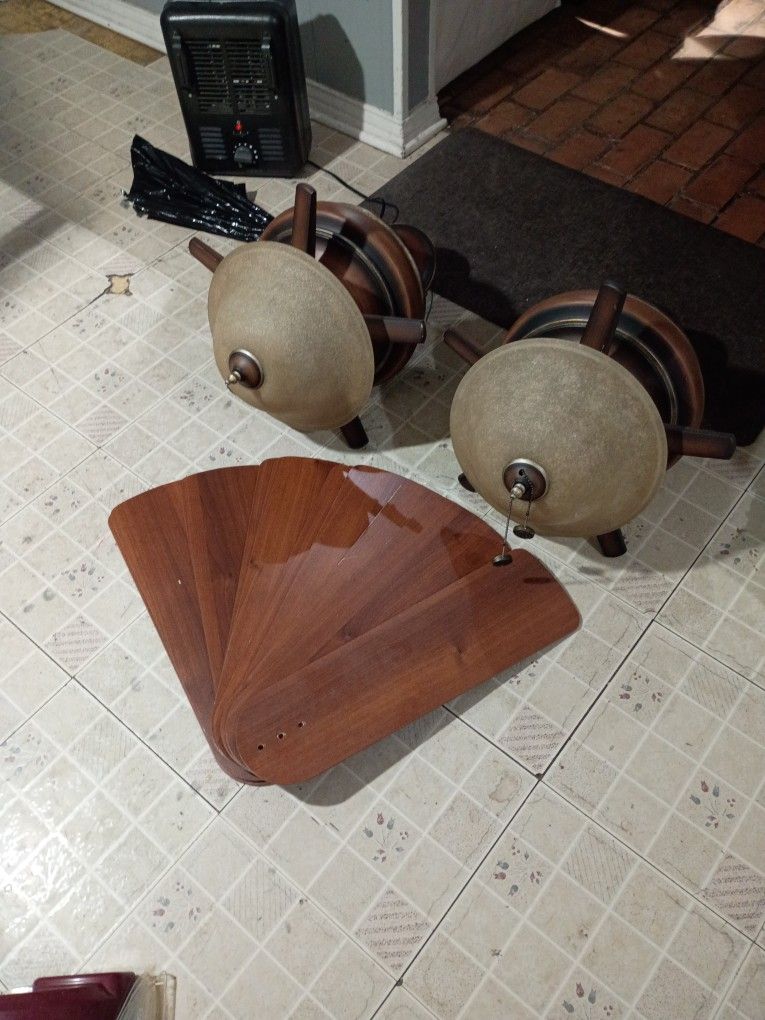 Hampton Bay ceiling fan with 21' blades,no remotes but can order for cheap at Amazon or Lowe's,they use the skinnier lightbulbs,both beautiful working ceiling fans,retail for a couple hundred for one,for the price your getting a steal.....$80 for 2