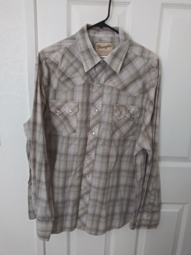 Men's "Wrangler" Wear Western Long Sleeve Shirt. Pearl Snap Buttons Down Front And On Cuffs. Size Is XL.