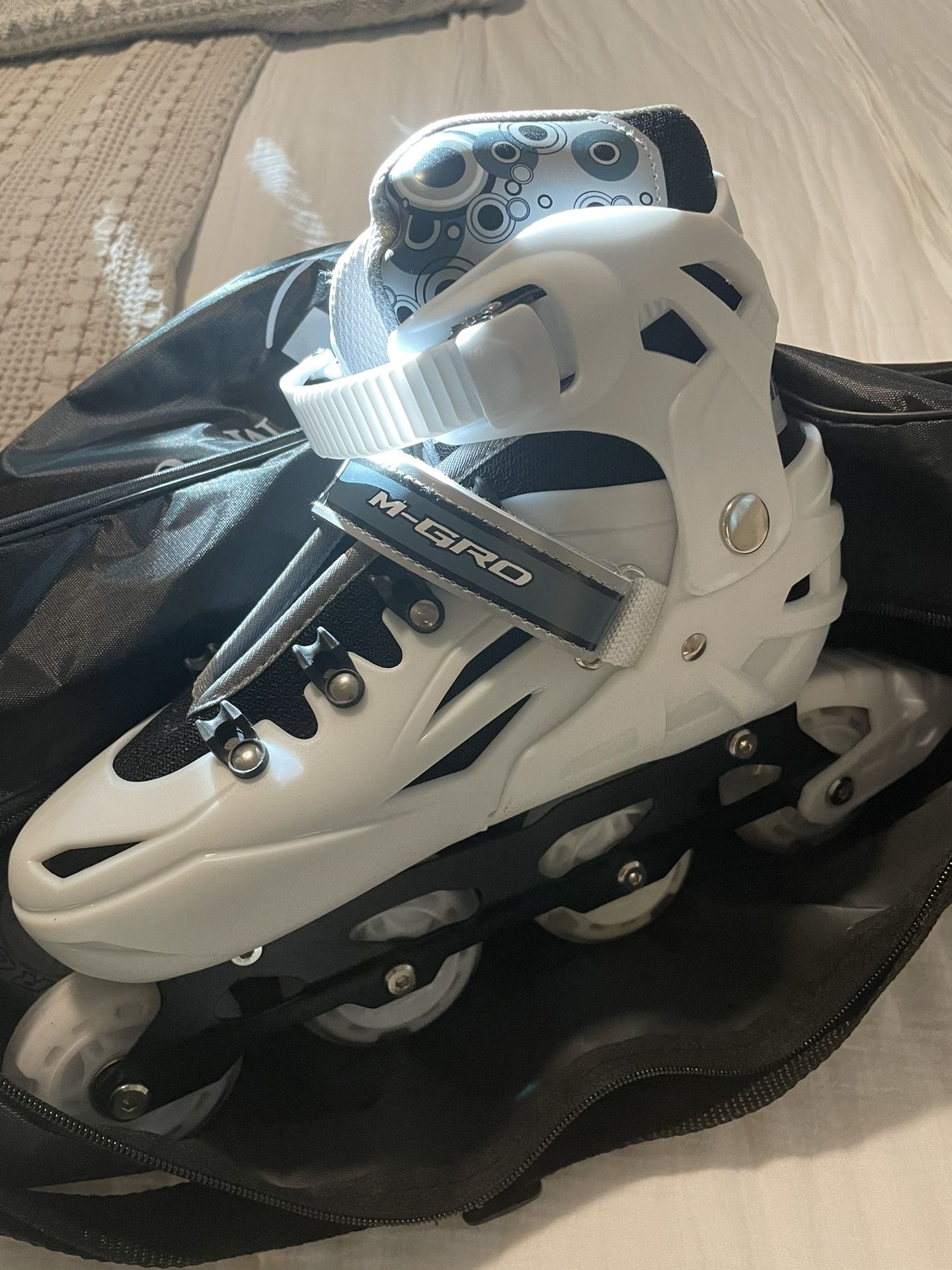 M-GRO rollerblades. Adult youth adjusting from size 4-8. Comes with carrying case. Brand new. Opened package, and never ended up using them.