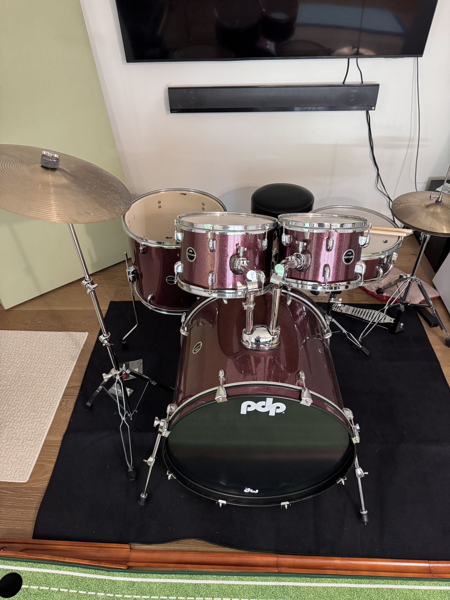 Hardly ever used. Everything is in perfect condition. Original price around $600 + tax. It includes drum keys and sticks. From Google: Encore 5-piece drum set is a comprehensive, entry-level kit featuring 100% poplar shells for a warm, punchy tone. It includes a 22"x16" bass drum, 10" and 12" rack toms, 16" floor tom, 14"x5.5" snare, double-braced hardware, cymbals, and a throne. Designed with DW's True-Pitch tension rods, it offers reliable, easy tuning for beginners