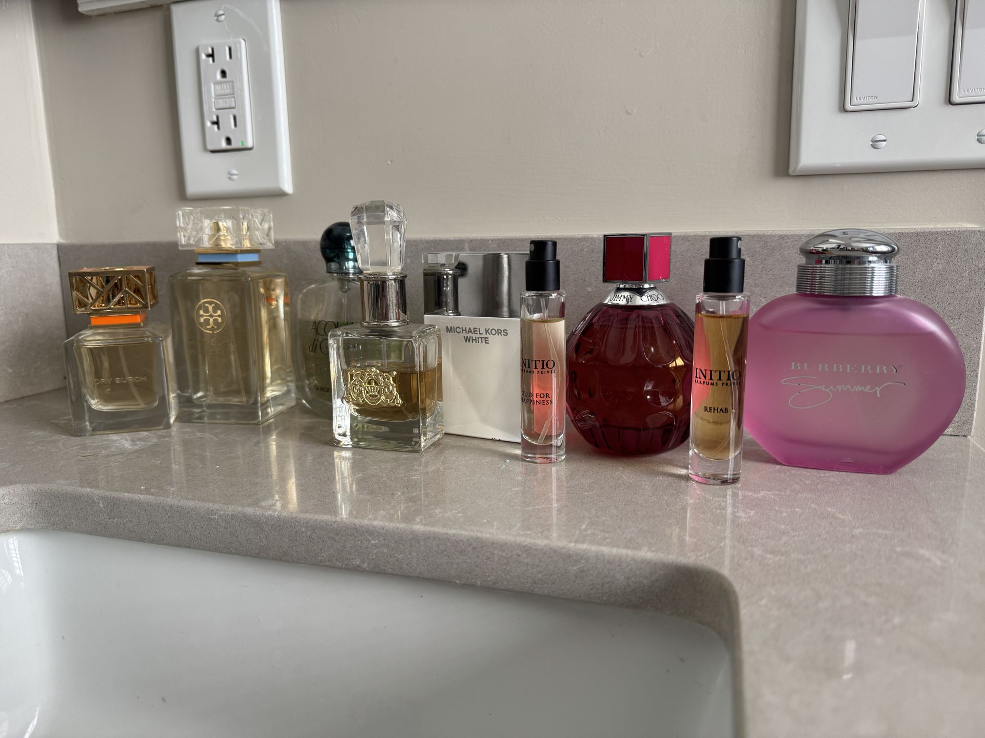 Perfumes are lightly used and most you can see how much is in the bottle. I am open to bundling if the deal is good, but looking for $60for the larger bottles and $30 on the smaller, each. Some pictured have sold separately Jimmy Choo Fever, Initio Rehab, Initio Oud for Happiness, Juicy Viva La Juicy, Giorgio Armani Acqua di Gioia. $150 for the listed ones above all together.
