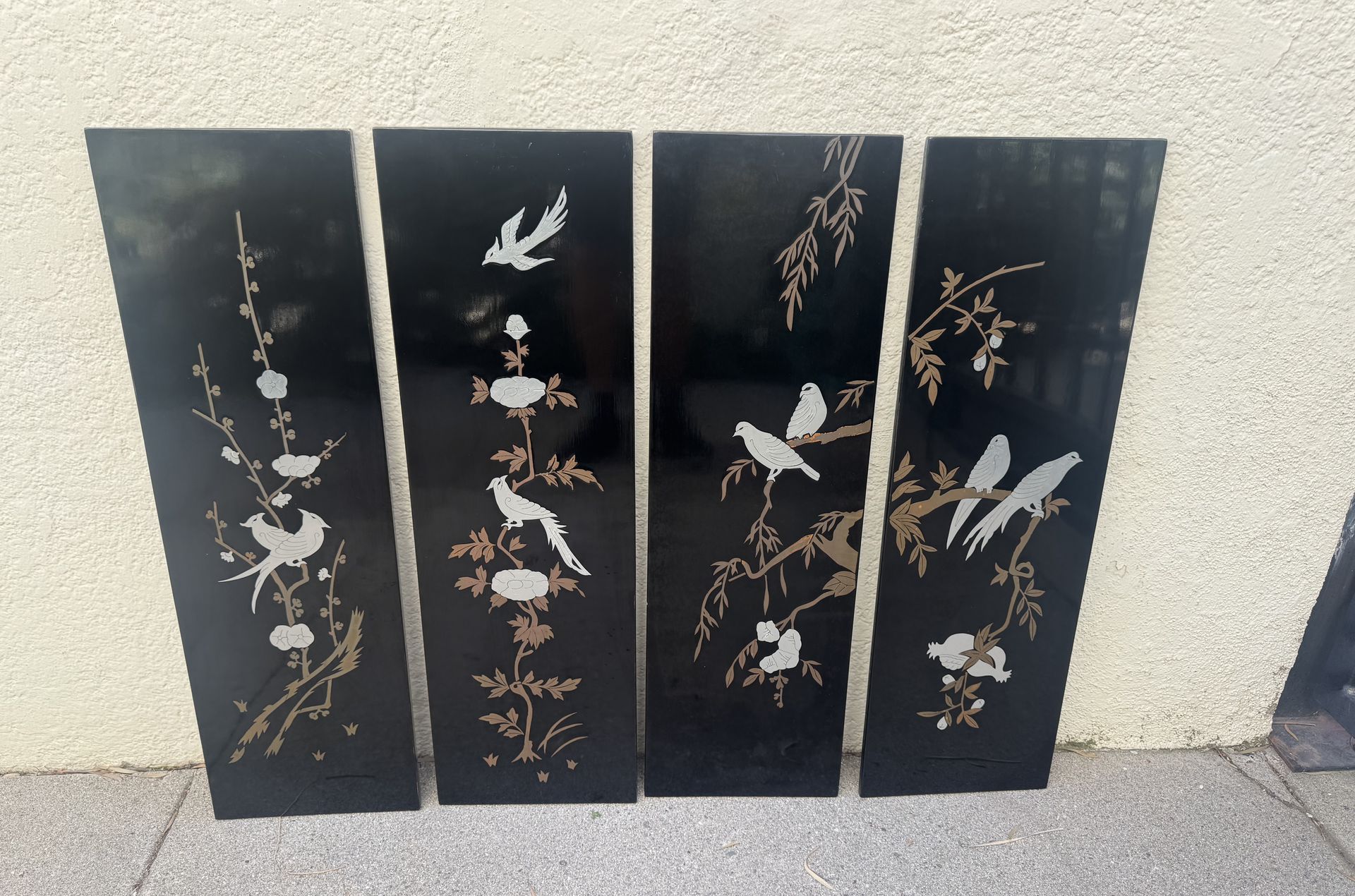 Panels are a set of four black lacquered wall art pieces featuring mother-of-pearl inlays of birds and floral motifs. Very good condition. Each Panel Length: ~ 8” Height: ~ 26” All 4 32x26 Price: $115 CASH ONLY