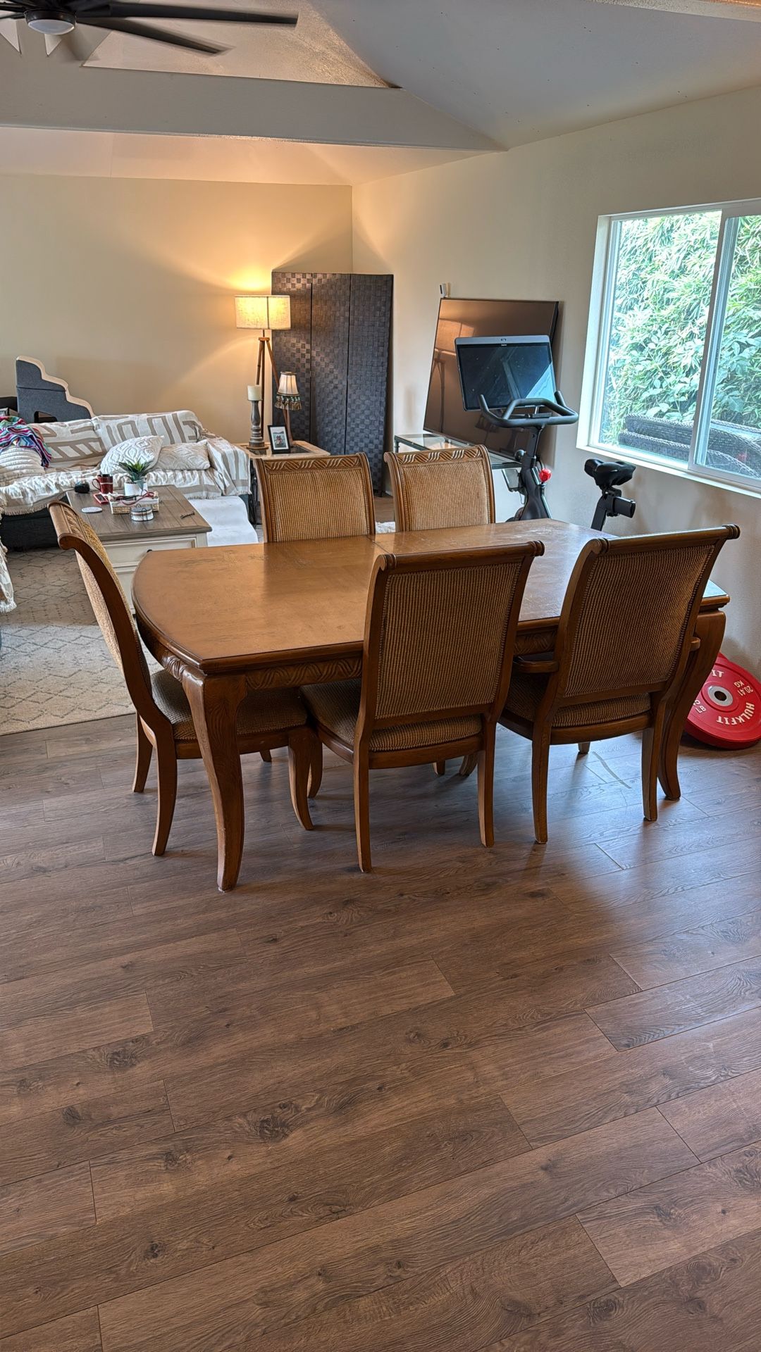 Dinning room table with 6 chairs. One not shown. Includes 2 leaves not shown.
