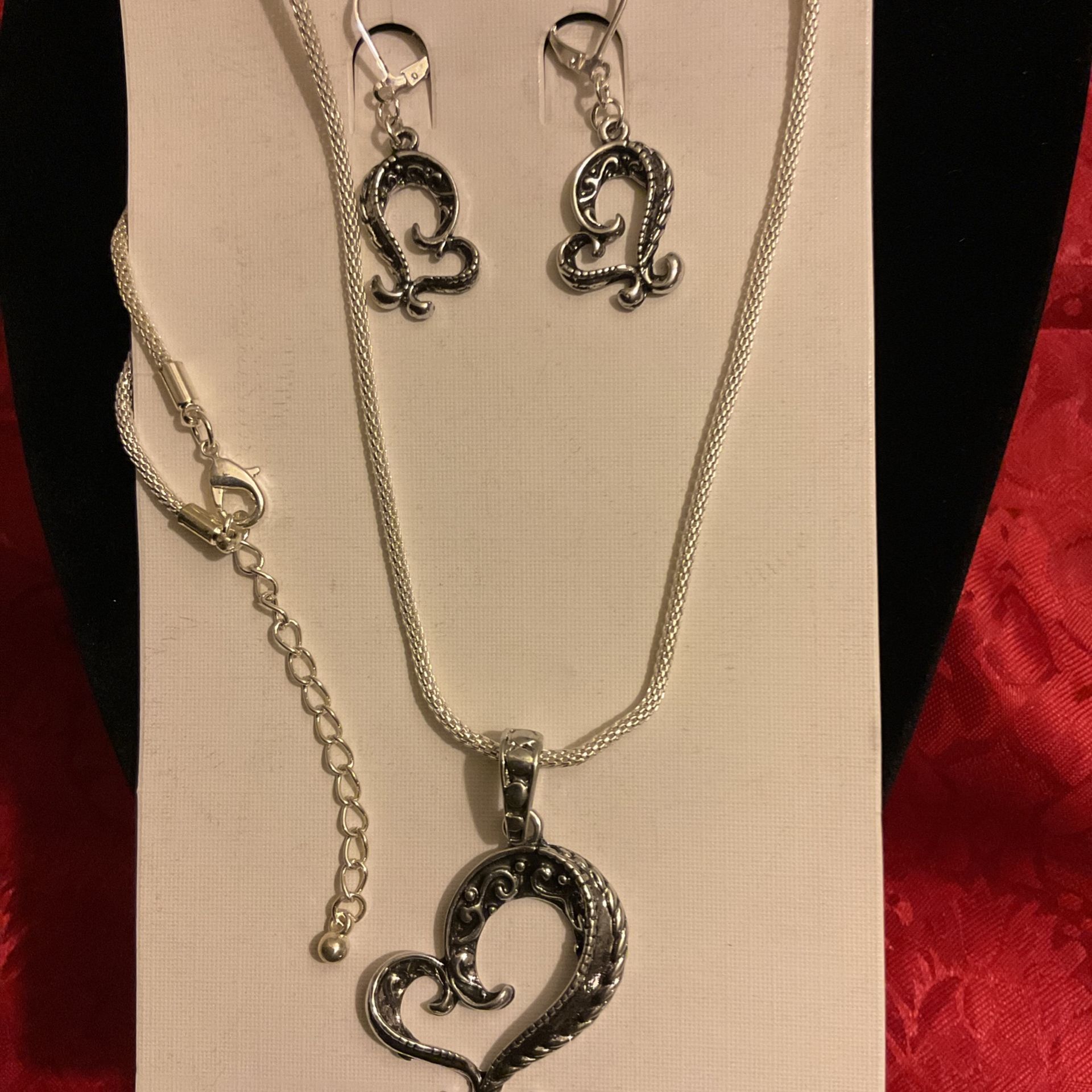 18”Silver Necklace With Fancy Heart Shaped Pendant W/matching Earrings Set