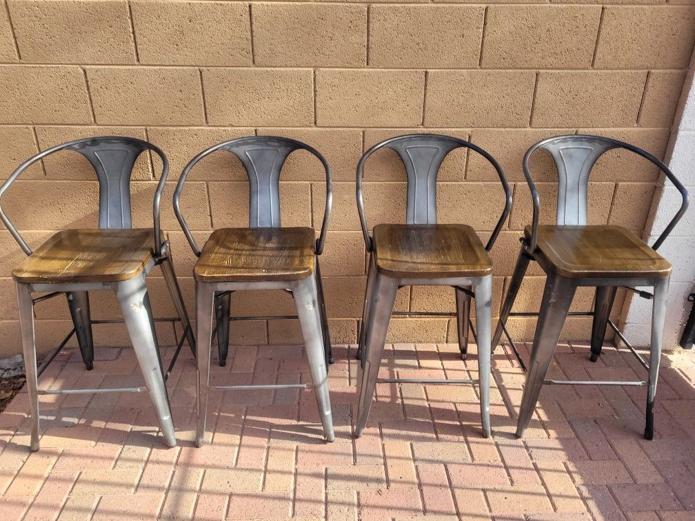 These are the very well made Vari brand. Excellent condition, needs dusting. Lightly inside home use only. Got them out today for pic. Bought two sets of two for almost $500. These have the foot rest andmetal plus wood seat. Also the marks, that look like scuffs or use marks, have been done on purpose from factory, all the chairs have them in the same place, Thanks! $180