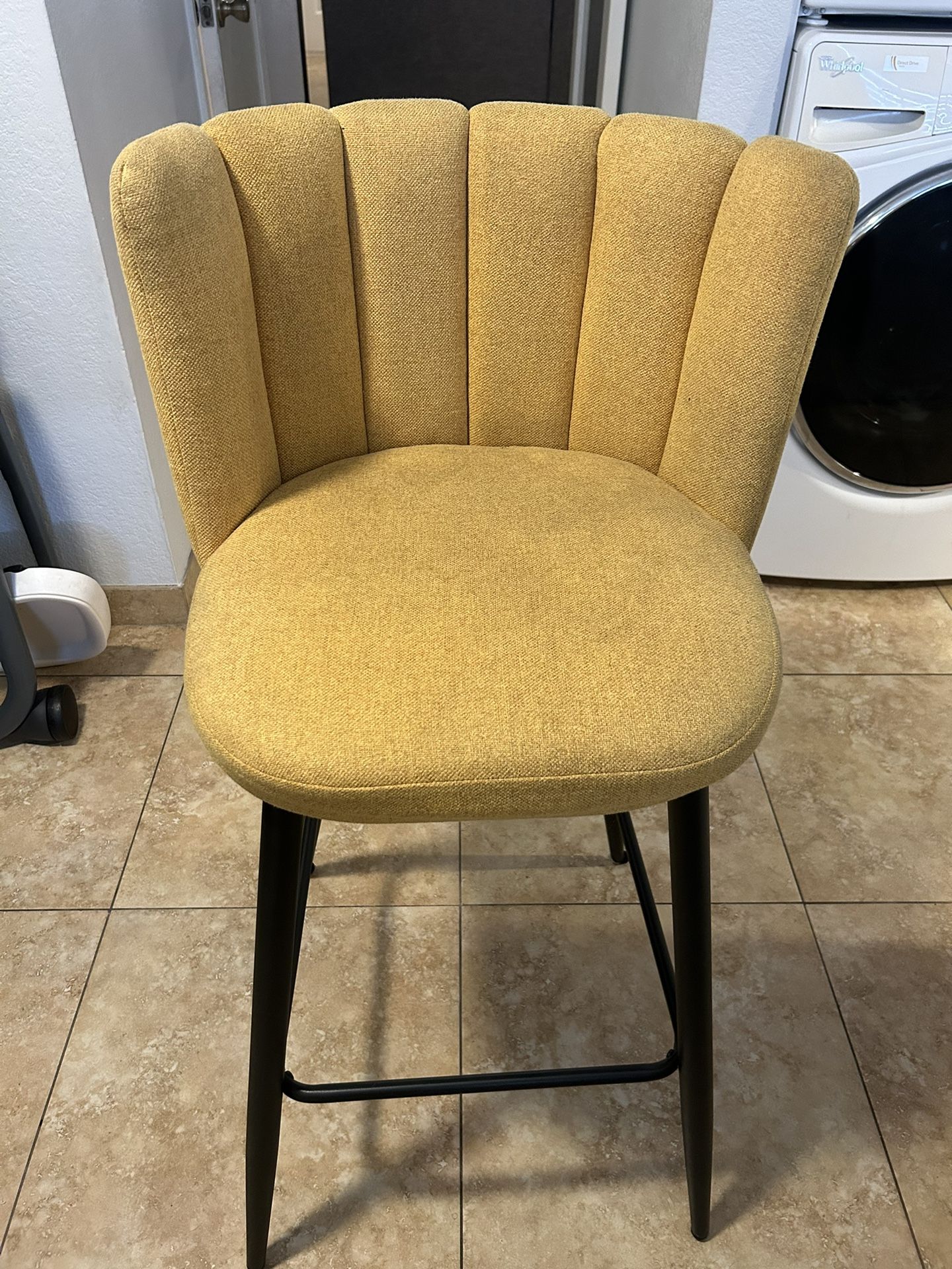 Mustard yellow bar stools. Bought off Amazon, they are counter height. Measurements are on Amazon listing.
