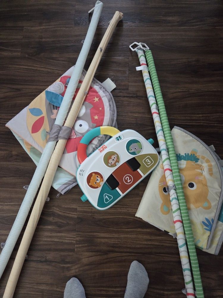 Comes with two plays mats, a standing piano, and baby toys that hang on the stick things.