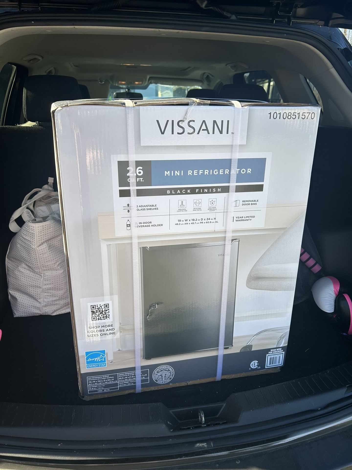 Brand new, still in box, 2.6 cubic feet, black finish, removable door bins, and adjustable glass shelves.