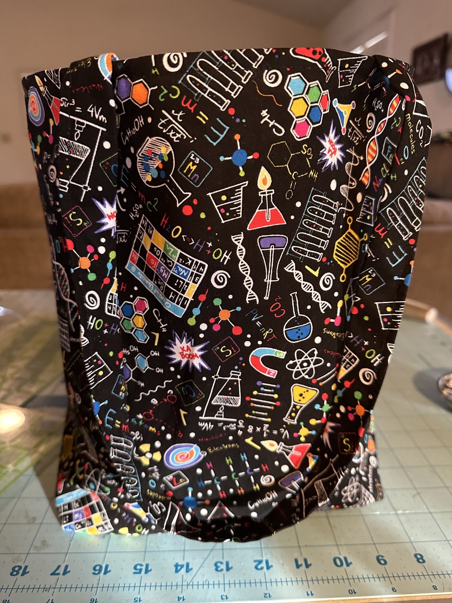 Handmade Science Fabric Bright Science Doodles, Math and Science Fabric printed bag. Size 16 by 16 inches. Has red lining and pocket inside.