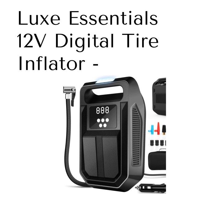 Make roadside emergencies and inflations easy with this Luxe Essentials digital tire inflator. Compact, powerful, and packed with features, it’s the perfect addition to your vehicle or garage. Brand: Luxe Essentials Model: 12V Digital Tire Inflator Condition: Brand new in original packaging with manual and all accessories Power Source: 12V car outlet (cigarette lighter plug) Features: • LED digital air pressure display • Preset pressure mode with automatic shut-off • Built-in flashlight, SOS, and warning light • Multiple nozzle attachments included • Ideal for car, motorcycle, bike tires, sports balls, balloons, kayaks & more Cord Length: Approx. 10 feet Includes: • Tire inflator unit • Nozzle attachments • Valve caps • Carrying case • Fuse and manual