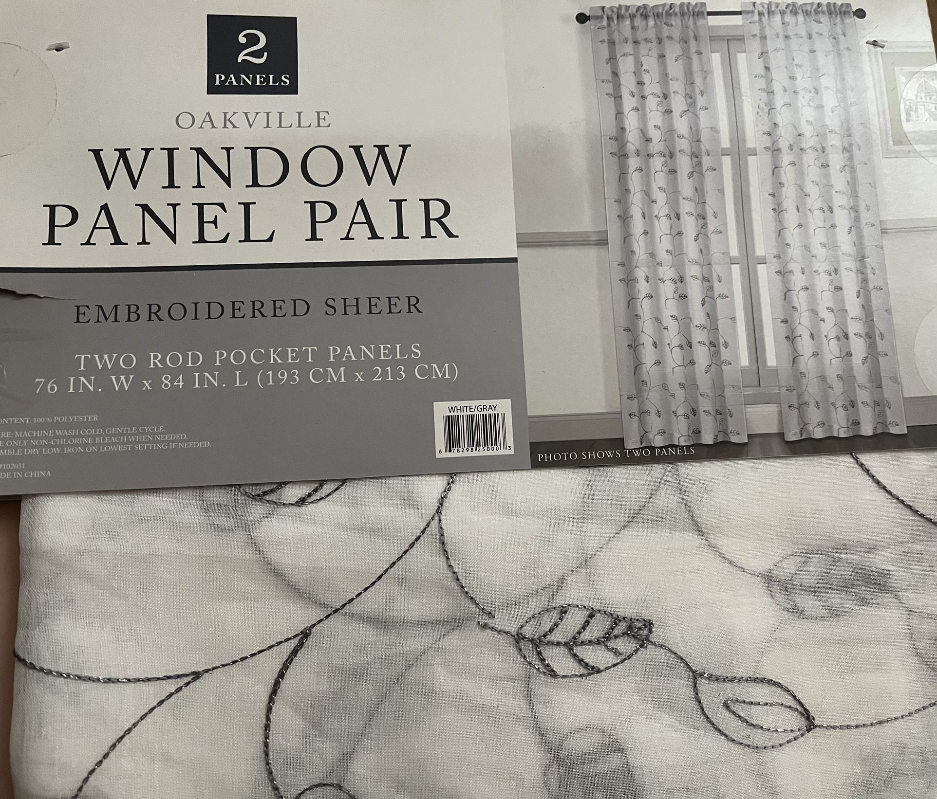 New curtain panels, white with silver . Really nice! Sheer with embroidery! 76” x 84”.
