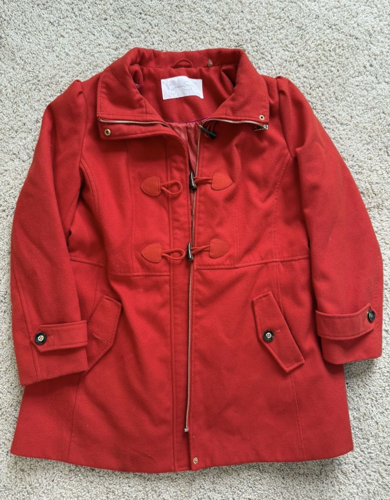 The Jessica Simpson Orange Cape Trench Coat is a stylish and versatile outerwear piece perfect for the fall and spring seasons. Made from durable polyester material, this mid-length coat features long sleeves, a hood, and a belt for added warmth and comfort. The bold red color adds a pop of color to your outfit, while the Jessica Simpson brand ensures quality and style. This coat is a must-have for any fashion-forward woman looking to stay warm and chic during the colder months.