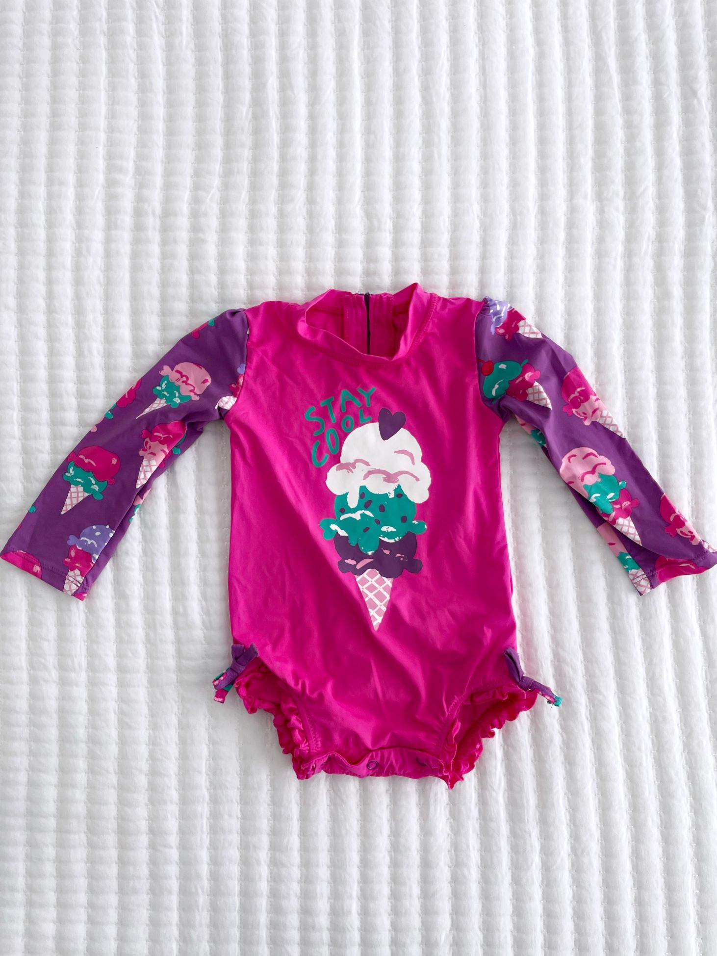 Perfect for your next beach vacation! Swimsuit lot for toddler girls ages 18-24 months. • RuffleButts one-piece rashguard with adorable bow detail and ice cream print Pre-loved and gently worn. From a smoke-free/pet-free home