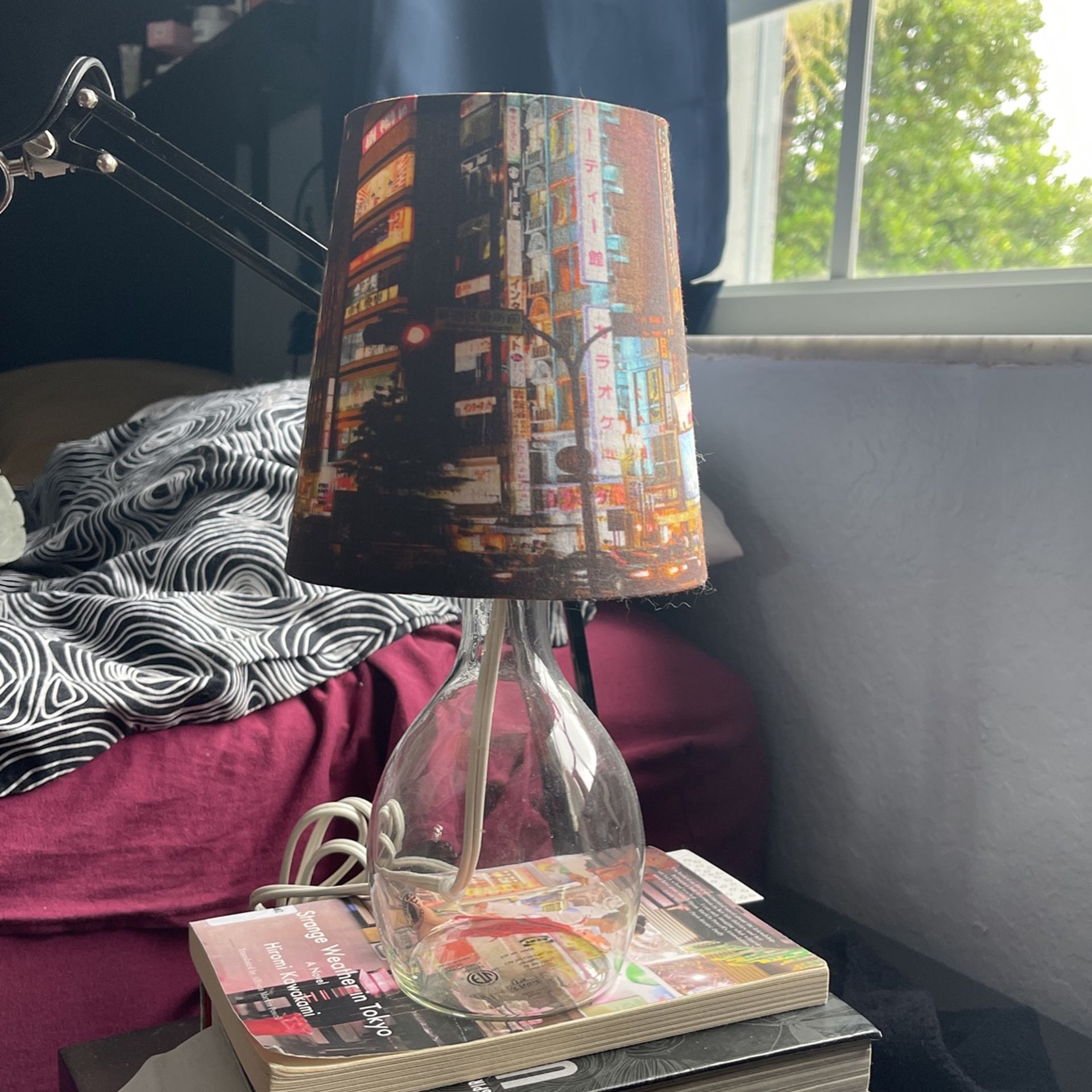 Brand new lamp. Clear glass base. Cityscape lmao shade