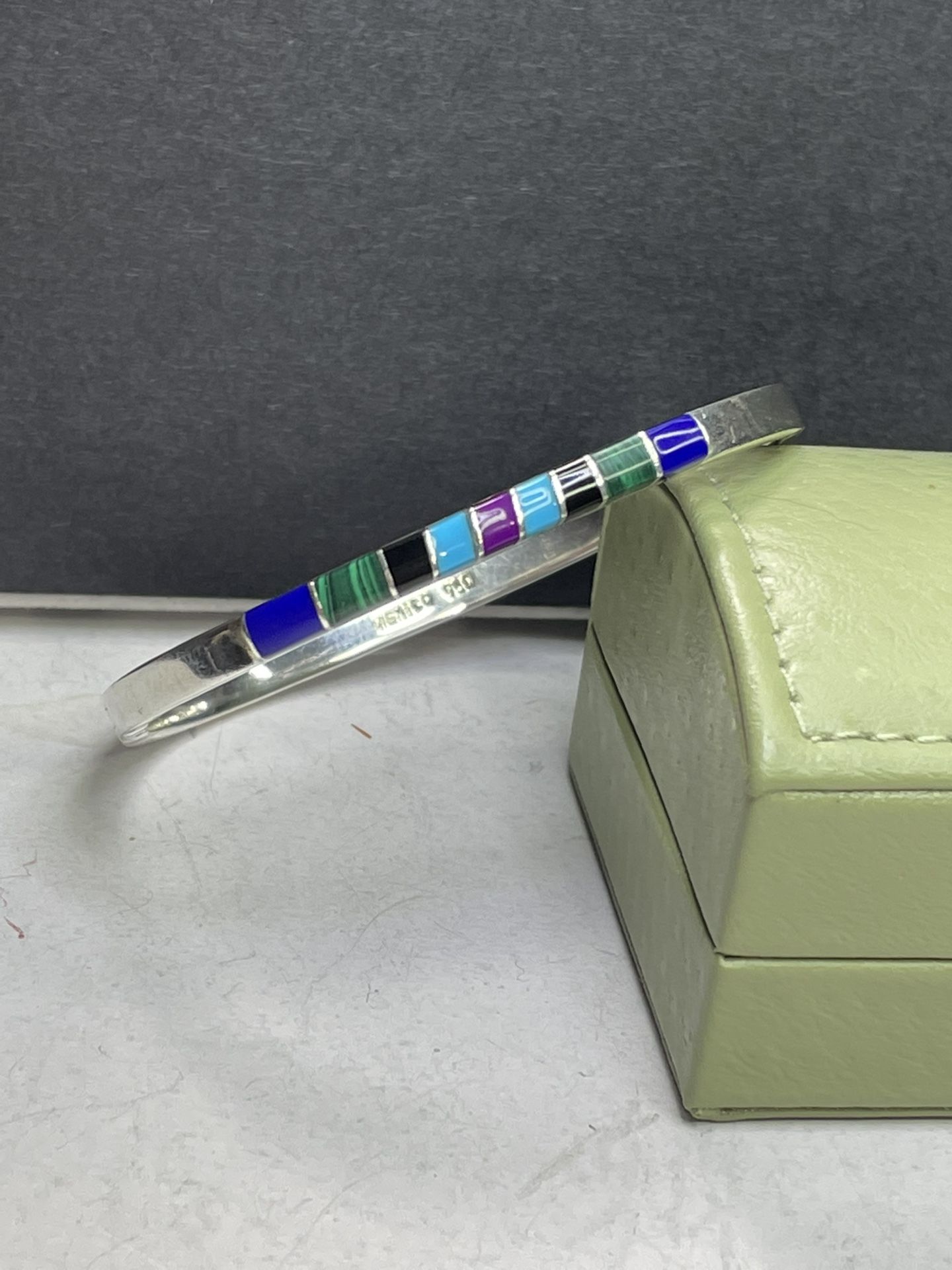 Here we have a beautiful silver bangle stamped Mexico 950 which is 95% silver. A little more pure than sterling. Adorned on top is blue turquoise, green malachite, black onyx and purple spiny oyster. It’s a dense bangle. Measures 8” around circumference. Opens up for fitting.