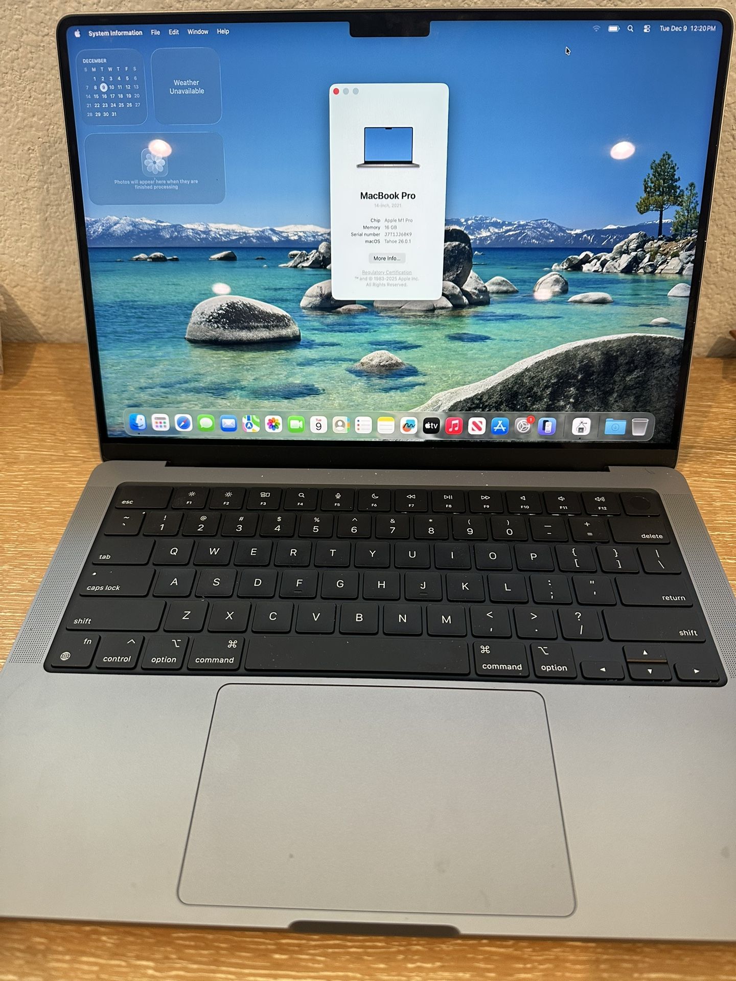 Selling my 14-inch MacBook Pro (2021) with the powerful M1 Pro chip. This model is known for its fast performance, amazing battery life, and beautiful Liquid Retina XDR display. Great for work, school, content creation, editing, and multitasking. Specs: • 14” Liquid Retina XDR display • Apple M1 Pro chip • 16GB unified memory (RAM) • ~500GB SSD storage (484.38GB usable) • macOS updated • Factory reset — ready for the next owner Condition: • Excellent condition • No major scratches or dents • Keyboard & trackpad in perfect working condition • Battery Health: Normal • Works flawlessly Includes: • Original charger Local pick up and cash only