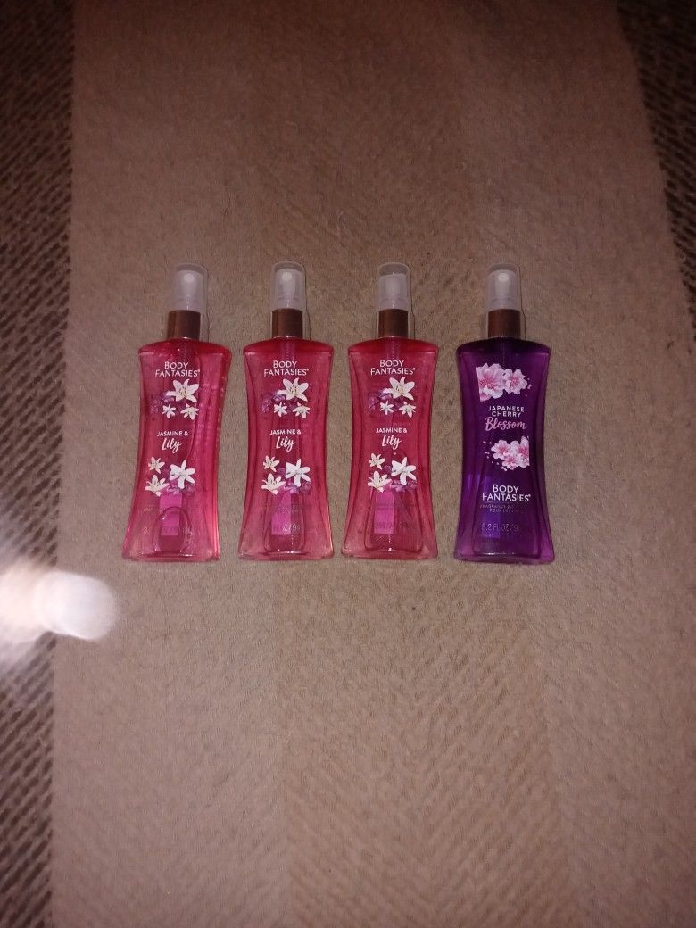 Selling brand new body sprays the three pink ones the scent is Jasmine and Lily the purple one the scent is Japanese Cherry Blossom