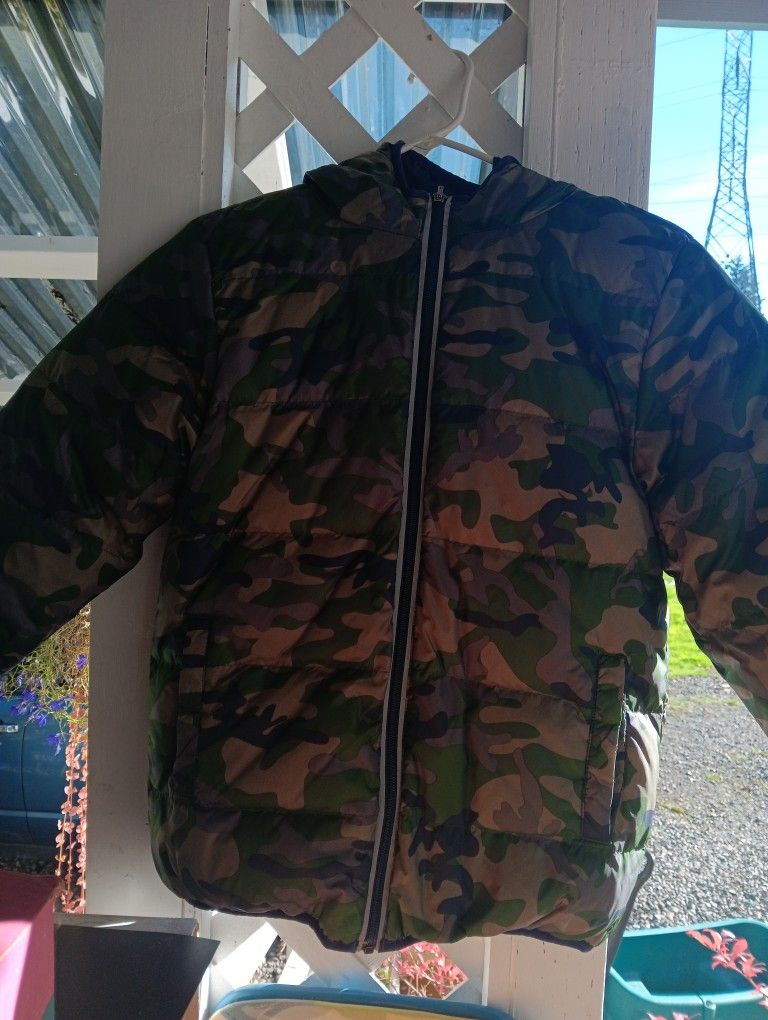 Dark blue on one side, camo on the other. Excellent condition. Zippers all work. No smells, stains, rips. I dont see a brand name or tag. I think it is a sz 7-8. Cash only. Meet up only. Non smoking home.