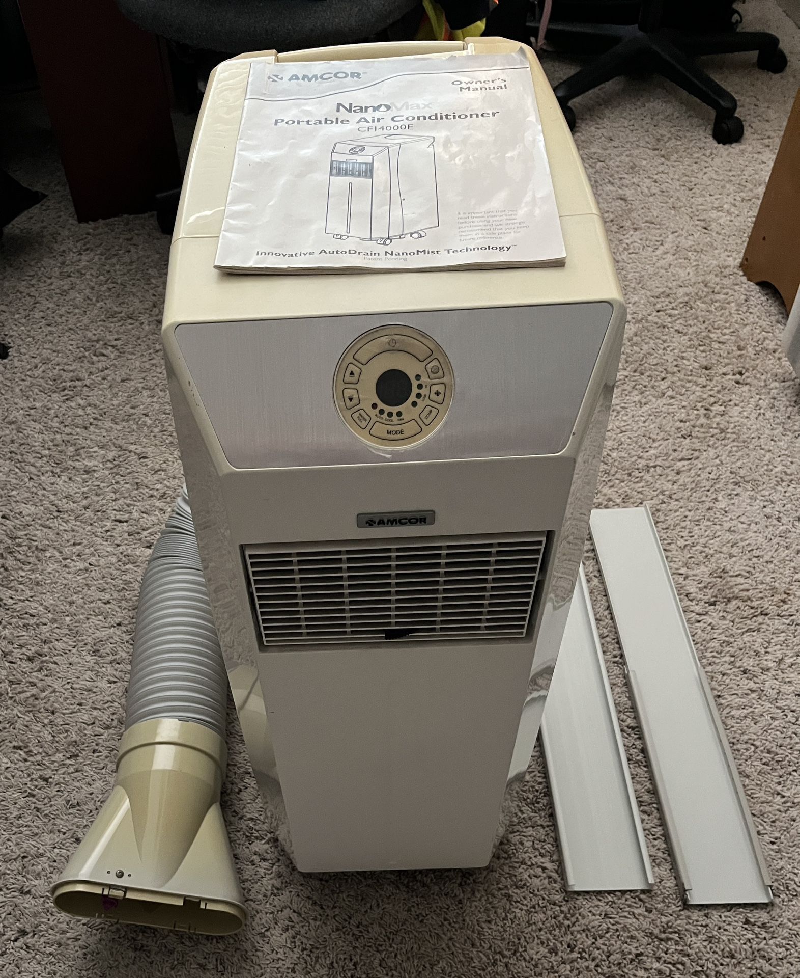 Used Amcor portable A/C unit, works well. Comes with new hose, exhaust hose window slide bar connector, adjustable window slide bar and manual.