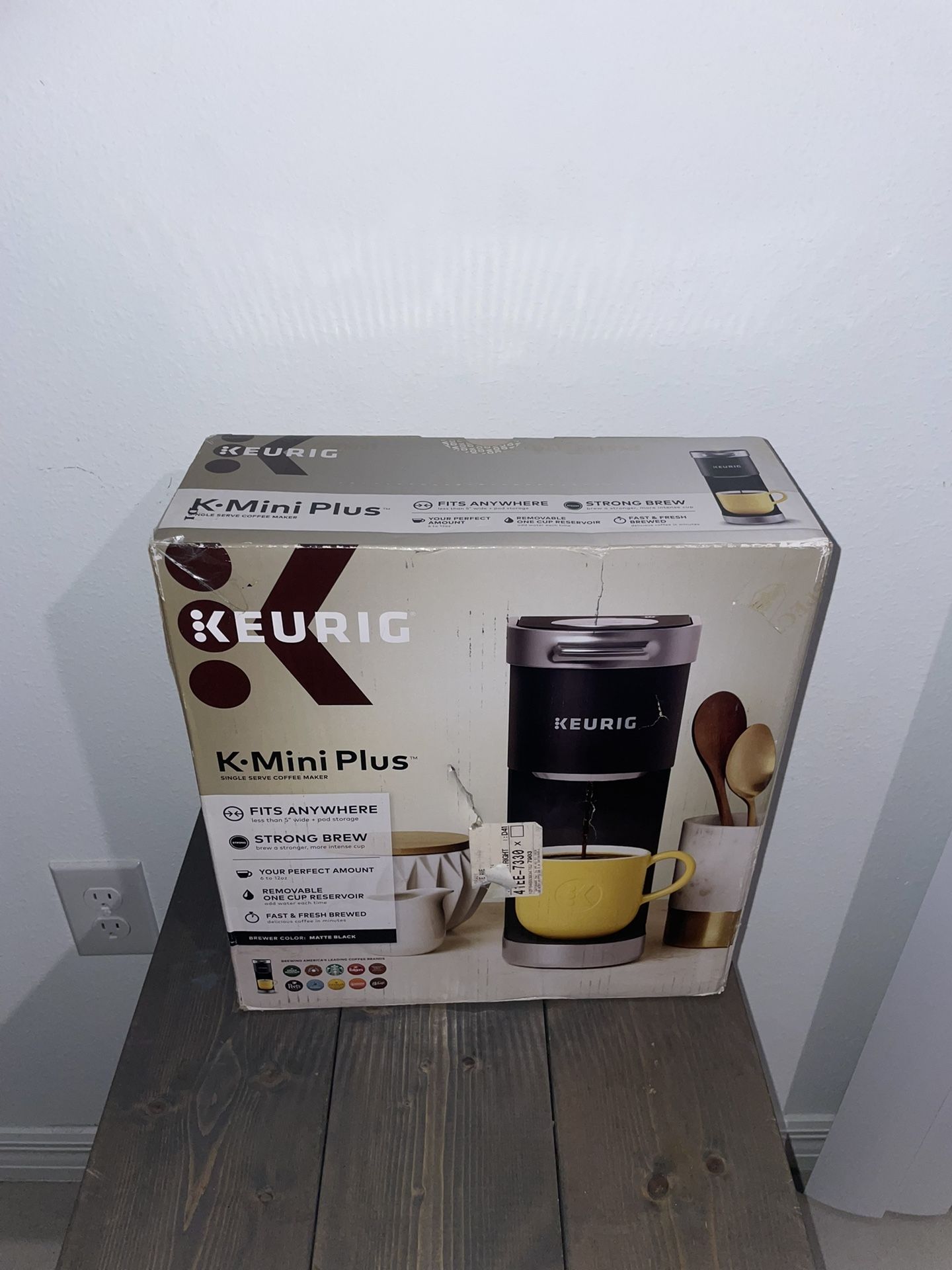 Keurig K-Mini Plus Coffee Maker – Single Serve (Matte Black) Description: Keurig K-Mini Plus single-serve coffee maker in matte black. Compact design fits almost anywhere. Features Strong Brew option, removable water reservoir, and brews 6–12 oz cups. Includes original box. Box has wear from storage. Great for home, office, RV, or dorm.