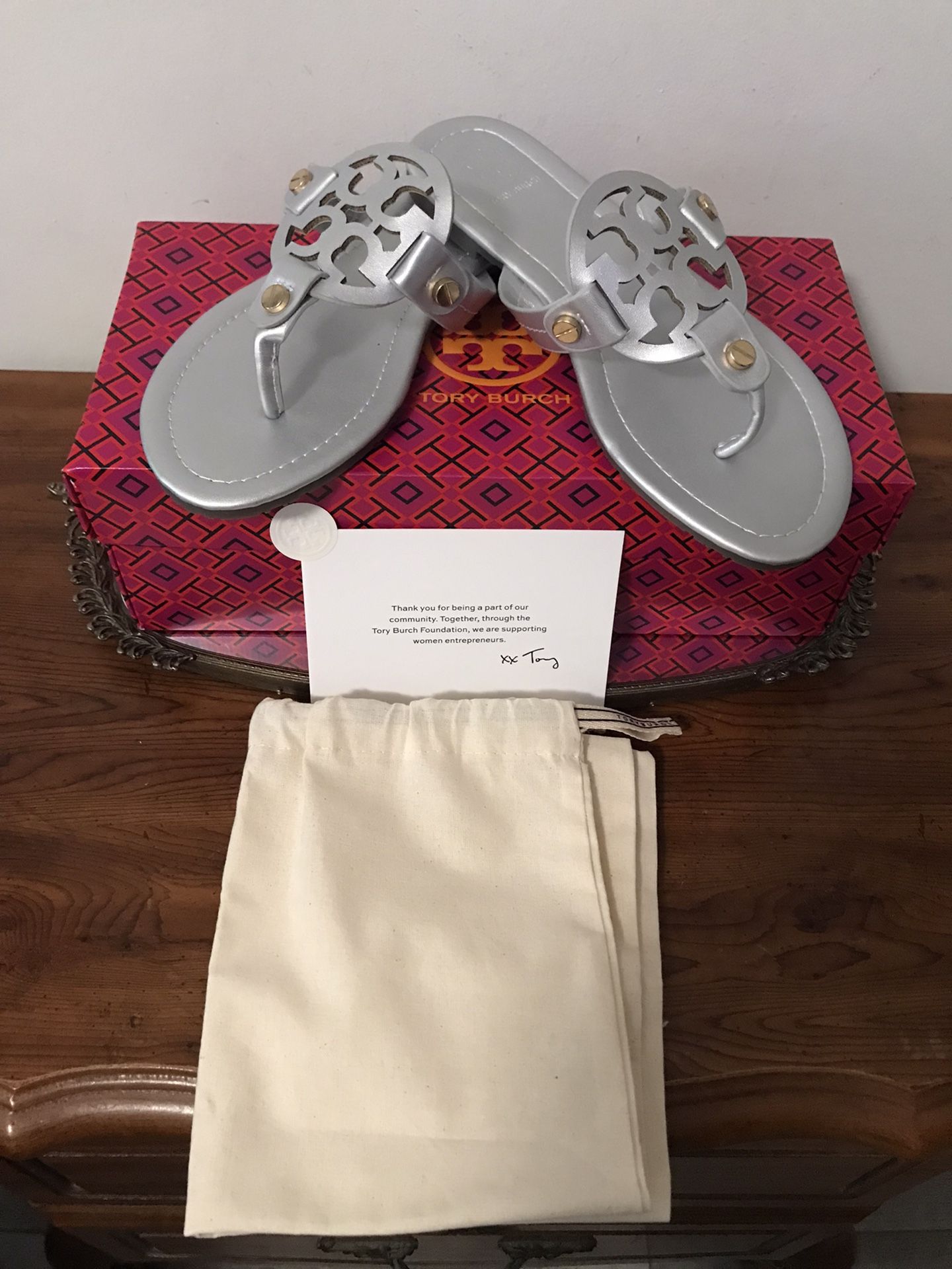NWT Tory Burch Miller Mirrored Metallic 🤍 Beautiful color will match anything you wear 🌹 In brand new condition never worn just tried on feels more like a size 8 they were a gift cannot guarantee they’re authenticity 🌷would make a great gift for anytime of the year 🍷 Enjoy!! Thank you!!❤️