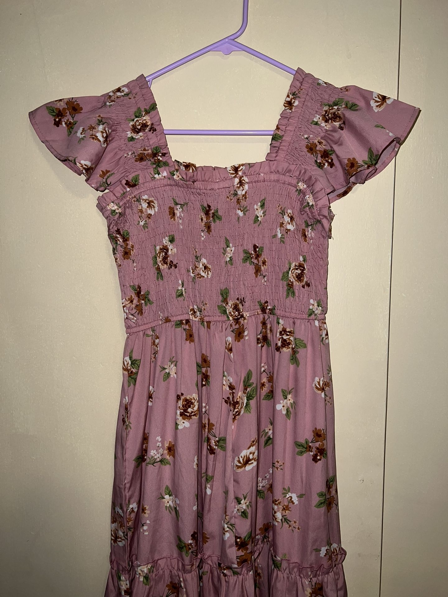 Summer dress, Long, Hugs the waist but flows at the bottom.