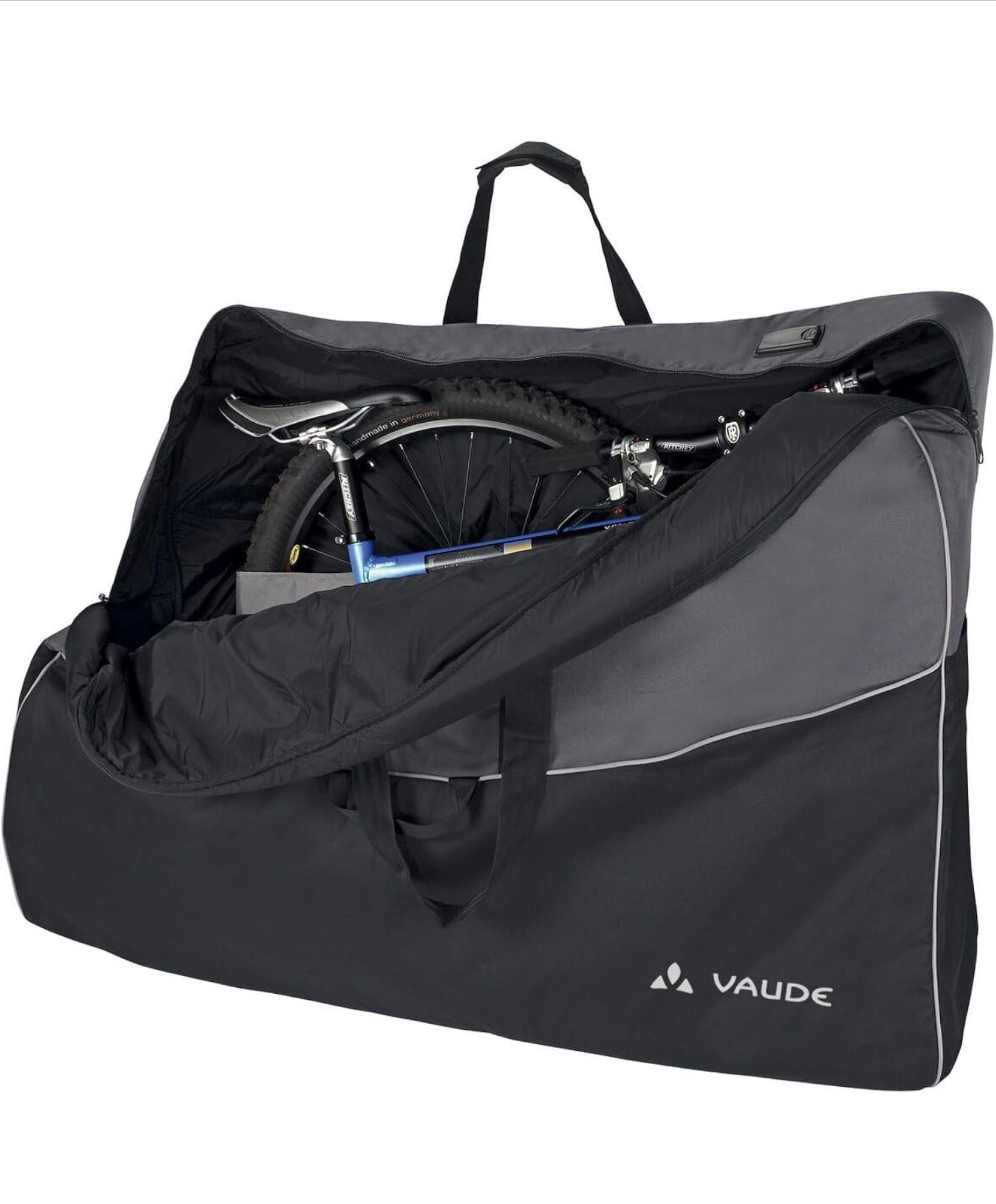 Pickup at Rite Aid parking lot 2240 W Sepulveda at Arlington Torrance 90501 during daylight hours. Nearly new! Used once. The VAUDE Big Bike Bag is a large, black nylon bicycle bag designed for adventure cycling. It features a zip closure, a carry handle, and can fold flat for easy storage when not in use. With dimensions of 50" in length, 11.5" in depth, and 30" in width, this bag offers ample storage space for all your cycling essentials while on the road. Its durable nylon material ensures reliable performance in various weather conditions, making it a practical and convenient accessory for cyclists looking to transport gear on their bike rides. Transportation bag for bicycle durable with inner pockets Remove the tires, turn the handlebars sideways, and pack it up! Our Big Bike Bag is durable and designed for easy, neat storage and transportation of all frames and wheels. With two long and two short carrying handles, you can choose how you want to safely carry it.