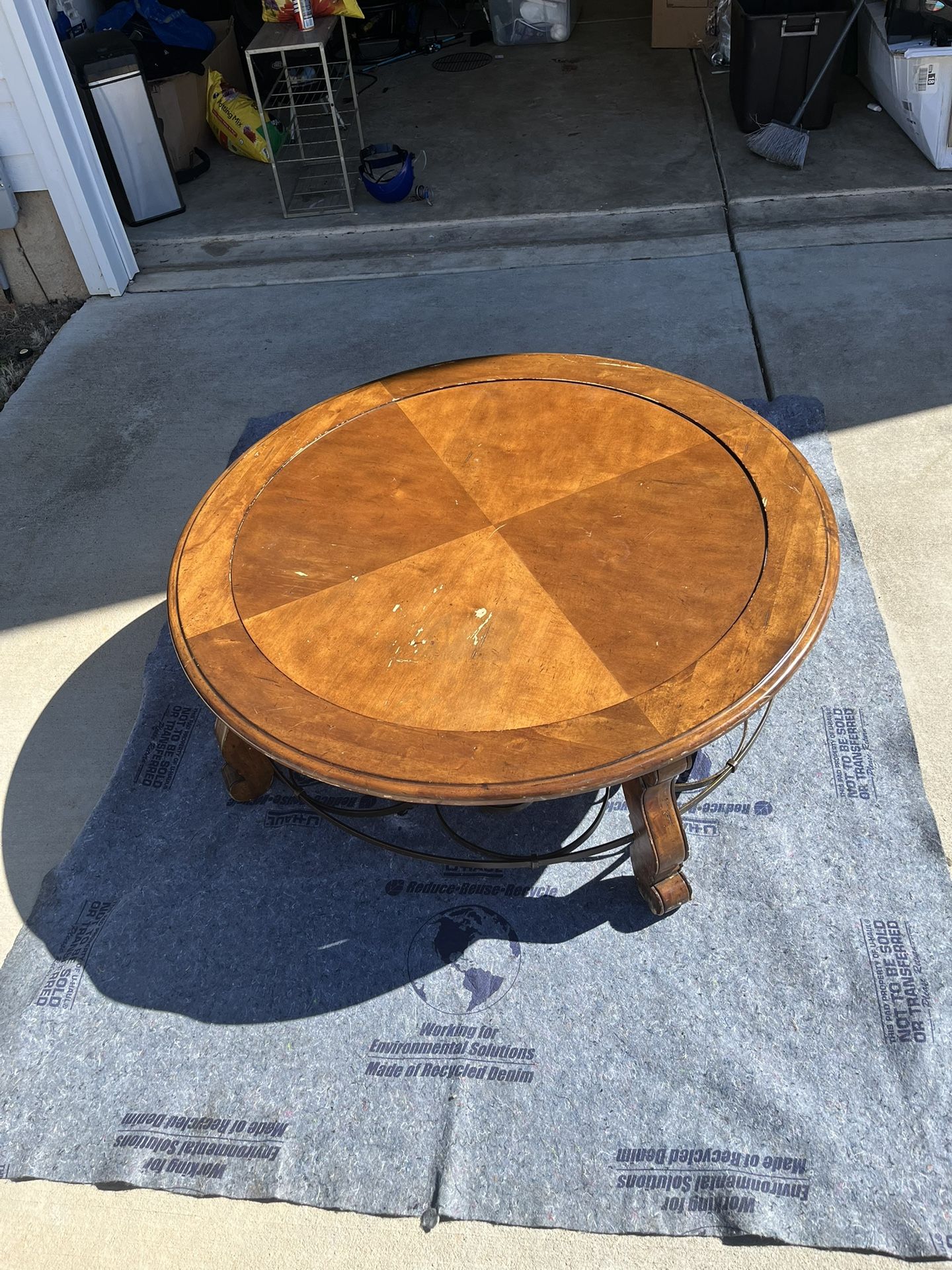 This table is great for a Center table in your living Room, it has normal wear and tear but is still in great condition. The center of the table rotates making Family night a lot more fun and easy playing games. The table can also be locked into place using the gold latch on the bottom.