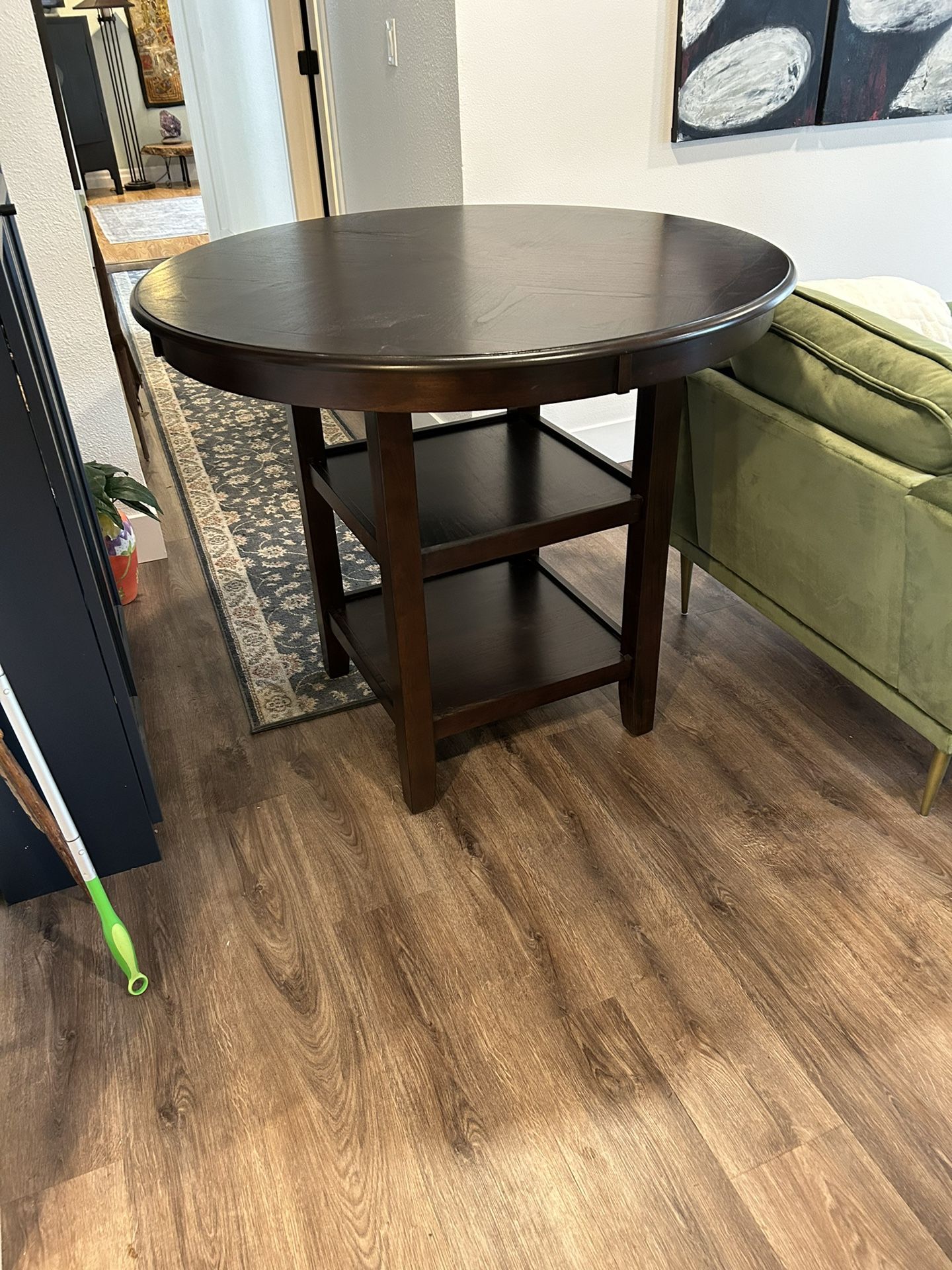 New hardly used. 100.00 . Most bar stools fit. Hard wood from Vietnam . Approx 3 ft tall3.5 ft diameter table top.