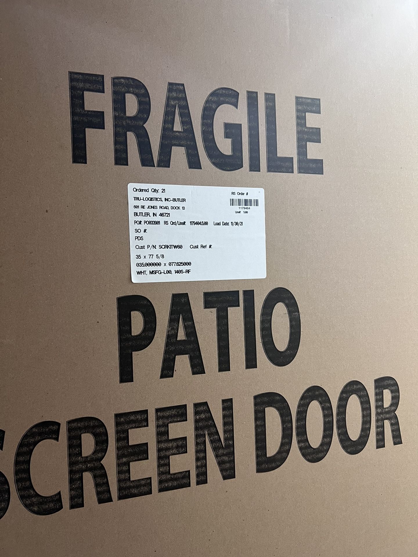 I have TWO new sliding patio screen doors 35x77 5/8. TRU-Logistics. $50 each