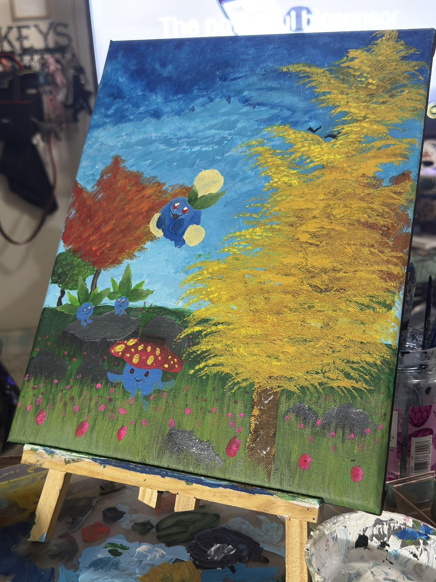 Pokemon inspired painting featuring Oddish, Vileplume, and Jumpluff in a tulip field in early autumn. The warm day hits their faces as they frolic and play. The scenery features a clear blue sky, oak trees, a maple tree, and a ginkgo tree. This piece was hand painted by me over several days and price includes shipping within the US. Just message me, I take cash, Venmo, and Apple Pay. Pickup in downtown Nashua, NH.