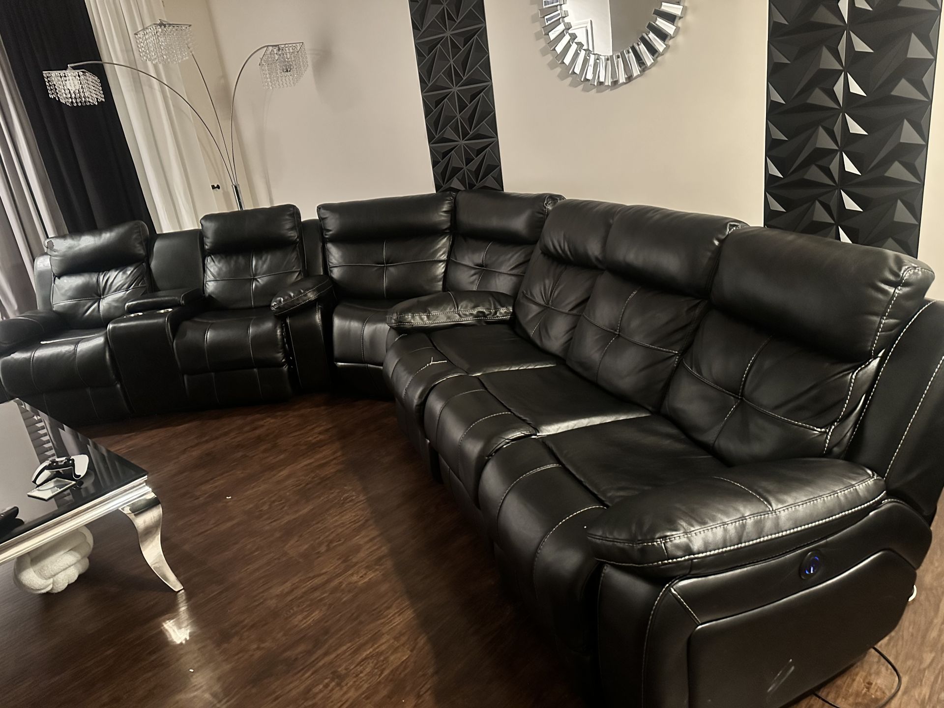 Black leather power reclining theater seating set in great condition. All recliners and features work perfectly. Very comfortable and only used a few months. One armrest has minor peeling (pictured), but overall the set is clean and well maintained. Includes: • 1 single recliner • 2-seater with console & cup holders • 3-seater with cup holders • LED power reclining controls