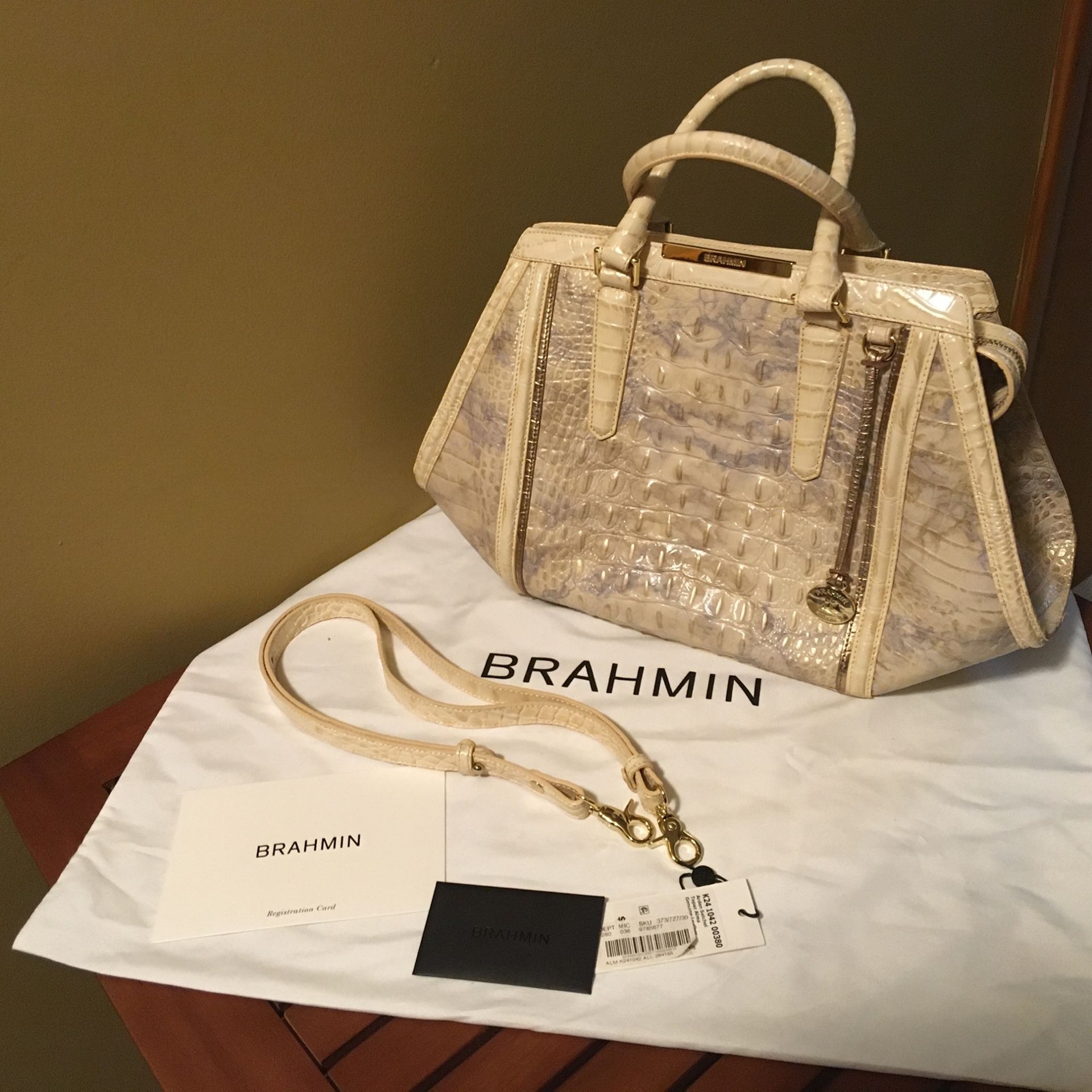 Brahmin Leather Arden Satchel Topaz Alma Beautiful cream and gold accent leather trim. The body has a little bit of blue almost opalescent. It’s beautiful! Comes with the long strap too. Originally $415.00. Never been used. Comes with the bag to store it in and everything that came with original purchase o